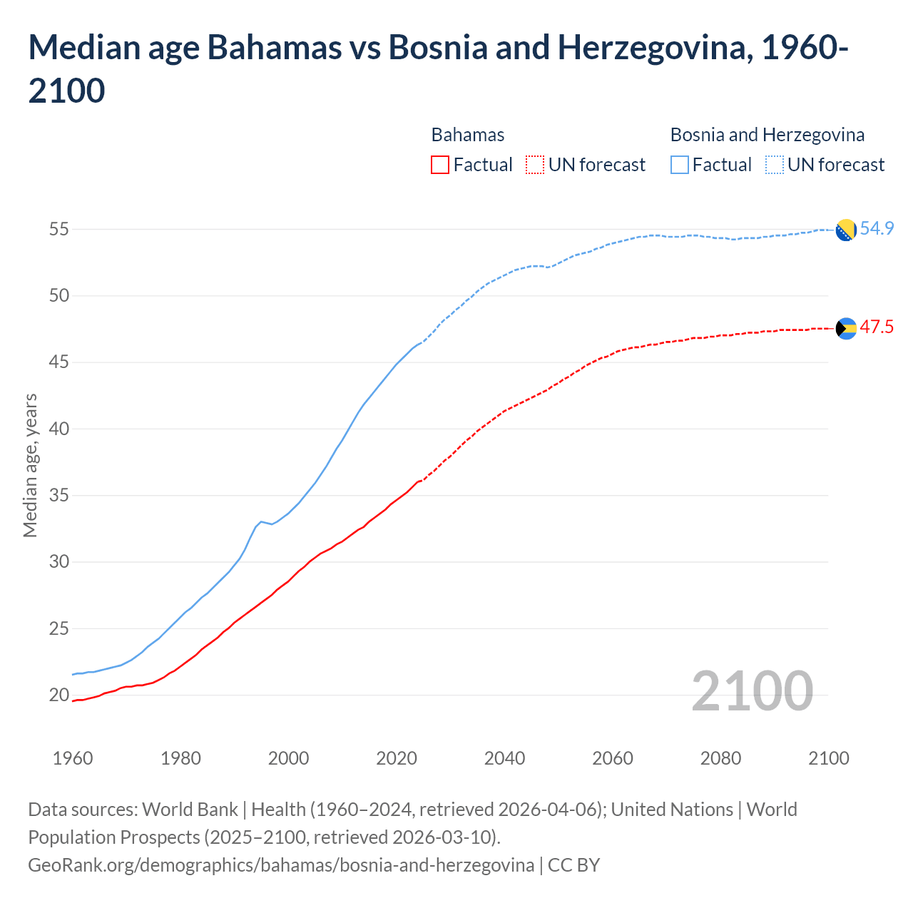 Median age Bahamas vs Bosnia and Herzegovina, 1960-2100