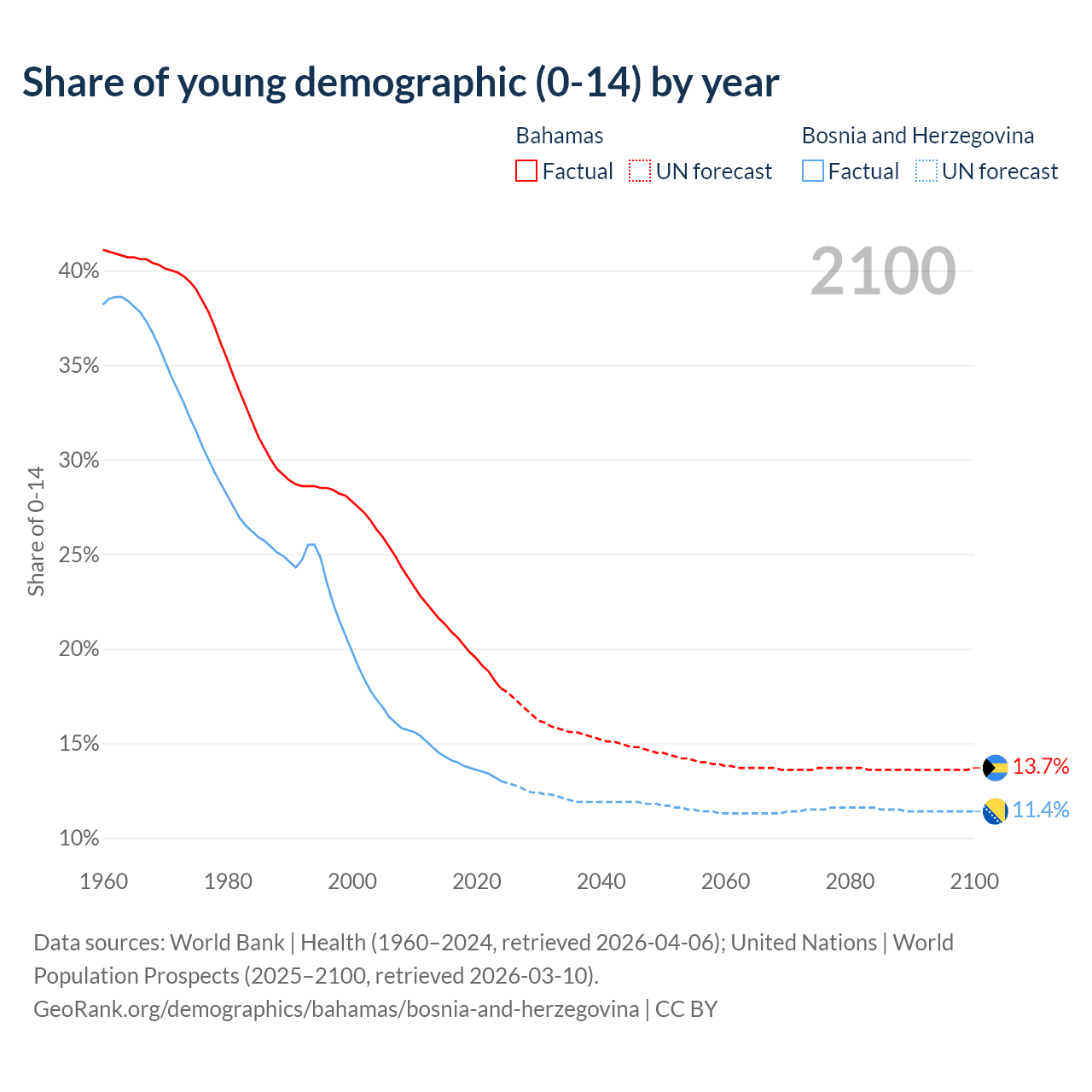 - The share of young demographic (0-15 years old) in the Bahamas is 17.9% vs 13% in Bosnia and Herzegovina.