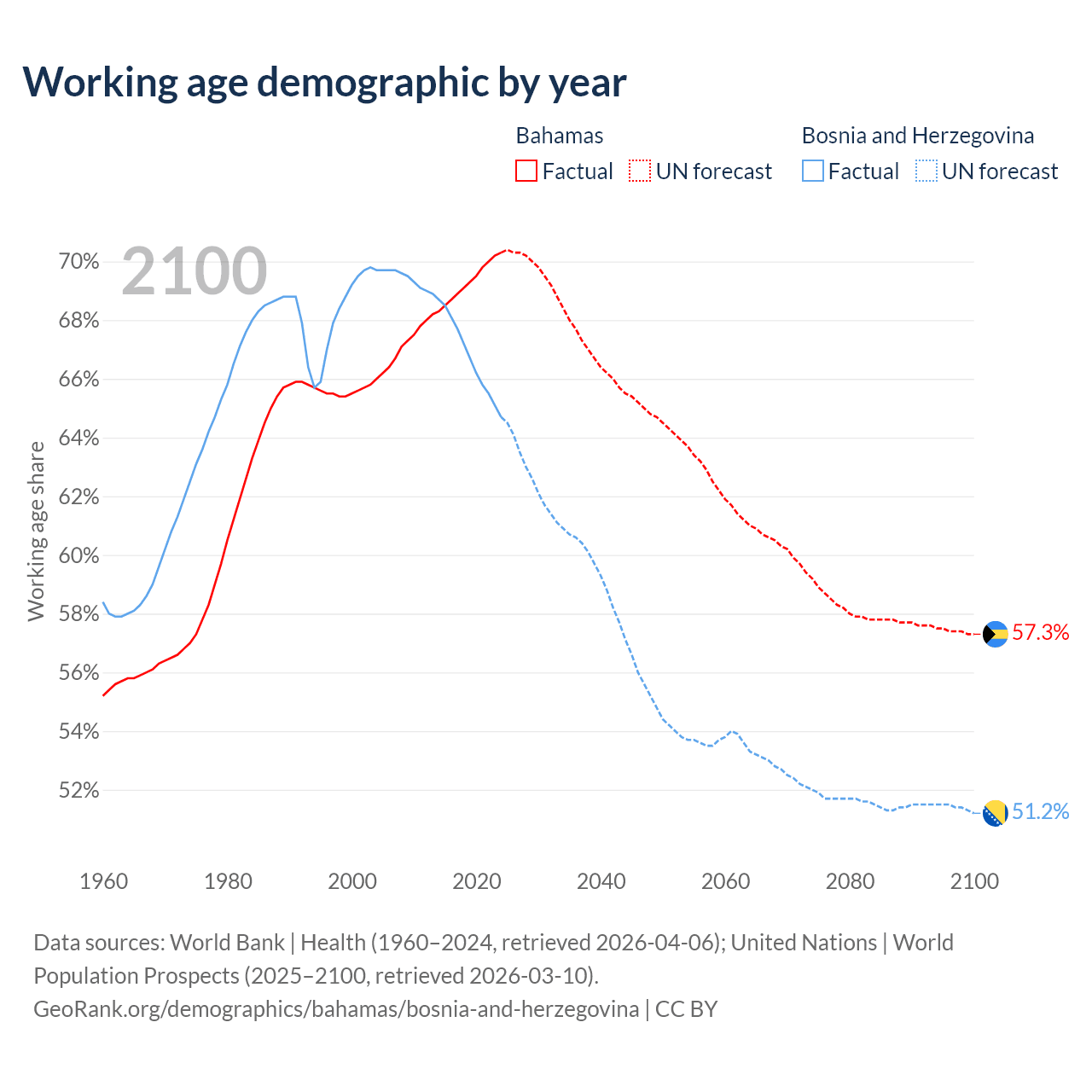 - The Bahamas has 285K working age adults (aged 15-64) vs 2.02M in Bosnia and Herzegovina.