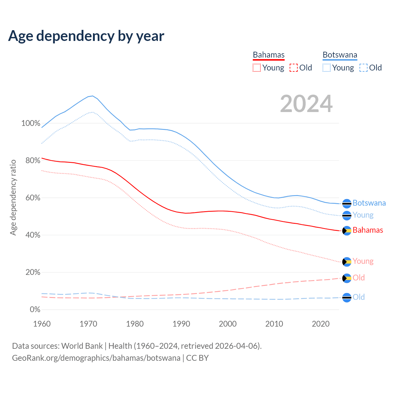 - The share of old-age demographic (65+) in the Bahamas is 11.8% vs 4.04% in Botswana.