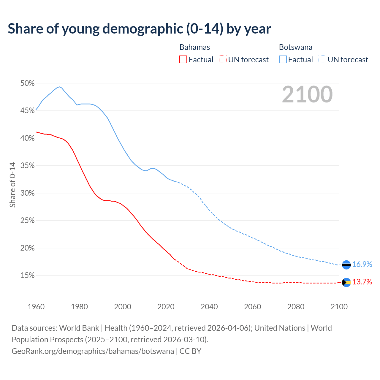 - The share of young demographic (0-15 years old) in the Bahamas is 17.9% vs 32.1% in Botswana.