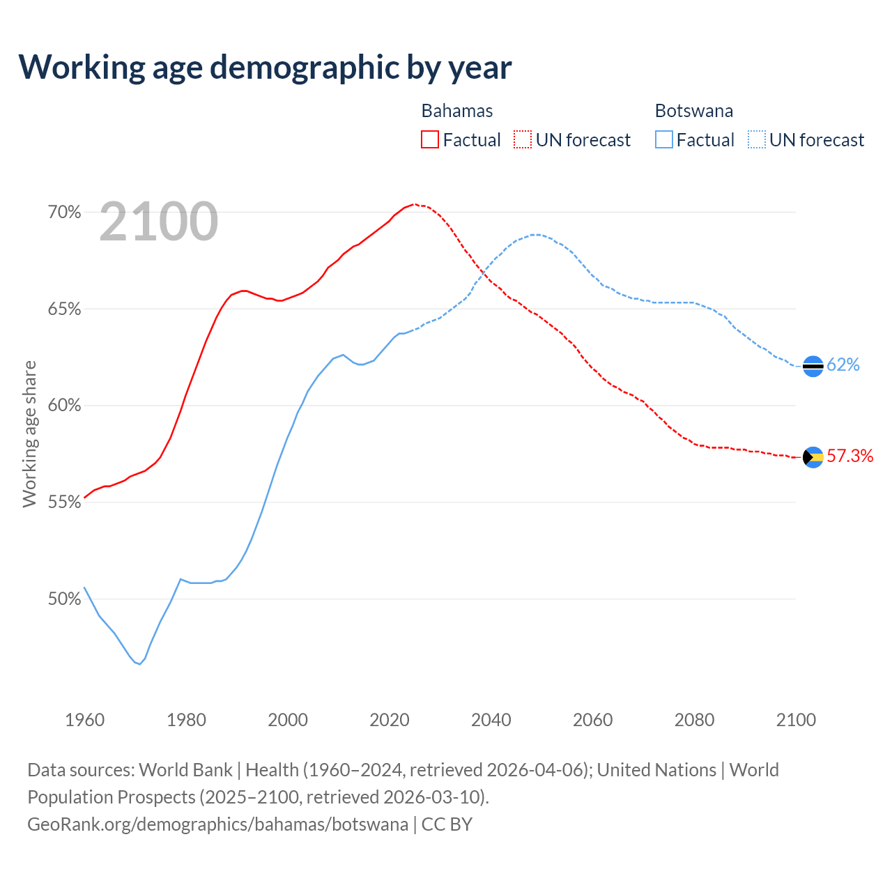 Median age Bahamas vs Botswana, 1960-2100