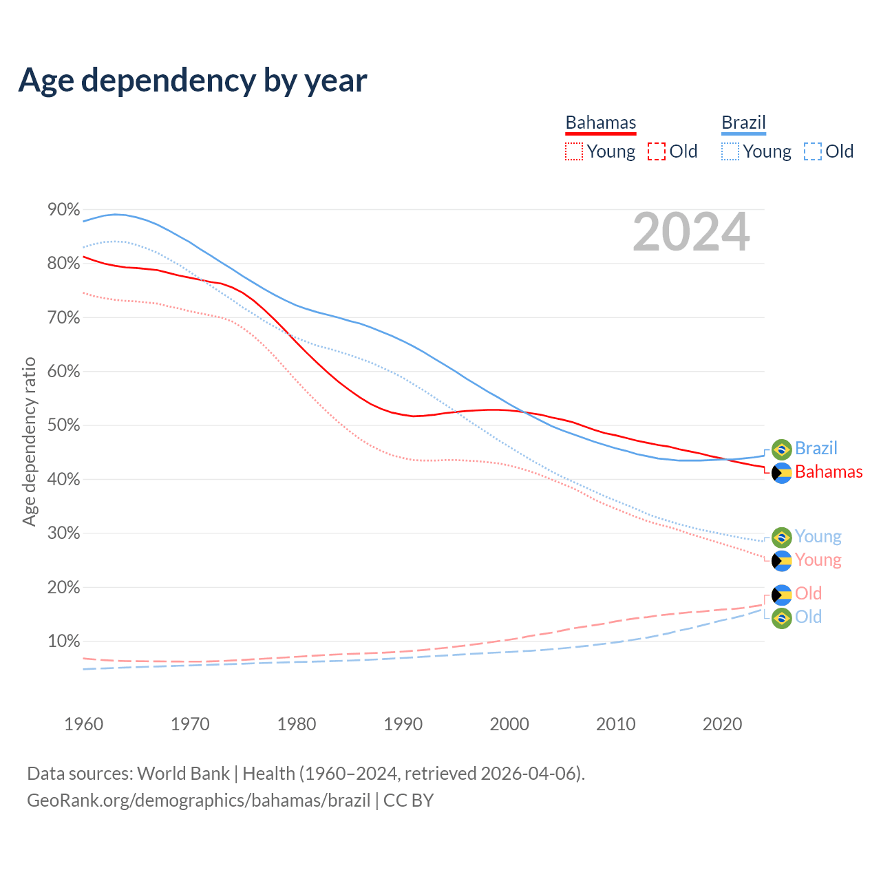 - The Bahamas is ranked 70/196 by median age (oldest to youngest) vs 73/196 for Brazil.