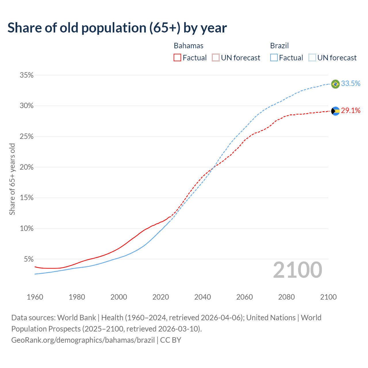 The share of older people aged 65 and over is 11.8% in the Bahamas and 11% in Brazil. Life expectancy in the Bahamas compared to Brazil .