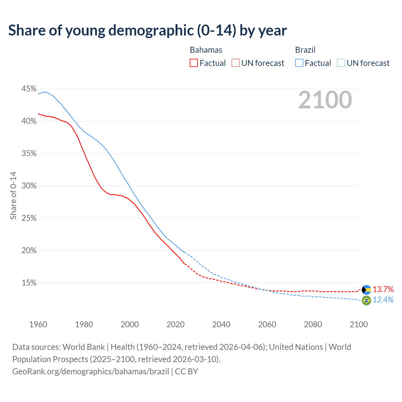 - The share of young demographic (0-15 years old) in the Bahamas is 17.9% vs 19.7% in Brazil.