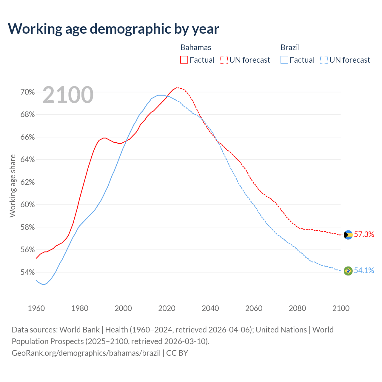 Median age Bahamas vs Brazil, 1960-2100