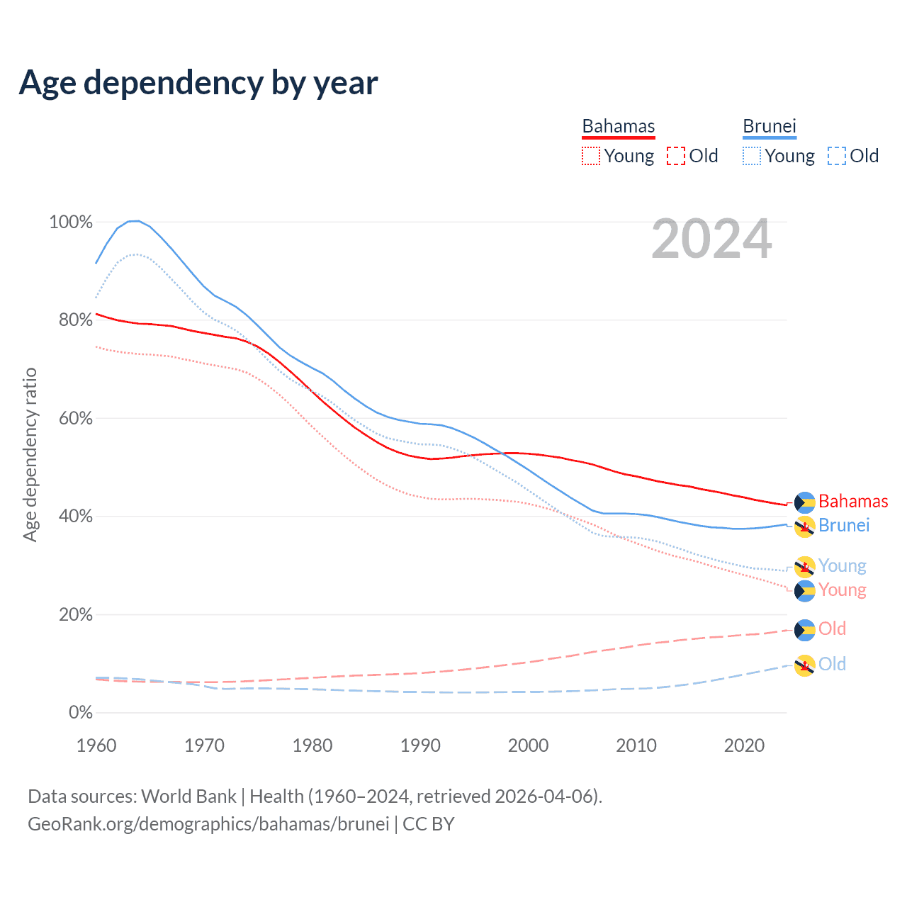 - The share of old-age demographic (65+) in the Bahamas is 11.8% vs 6.87% in Brunei.