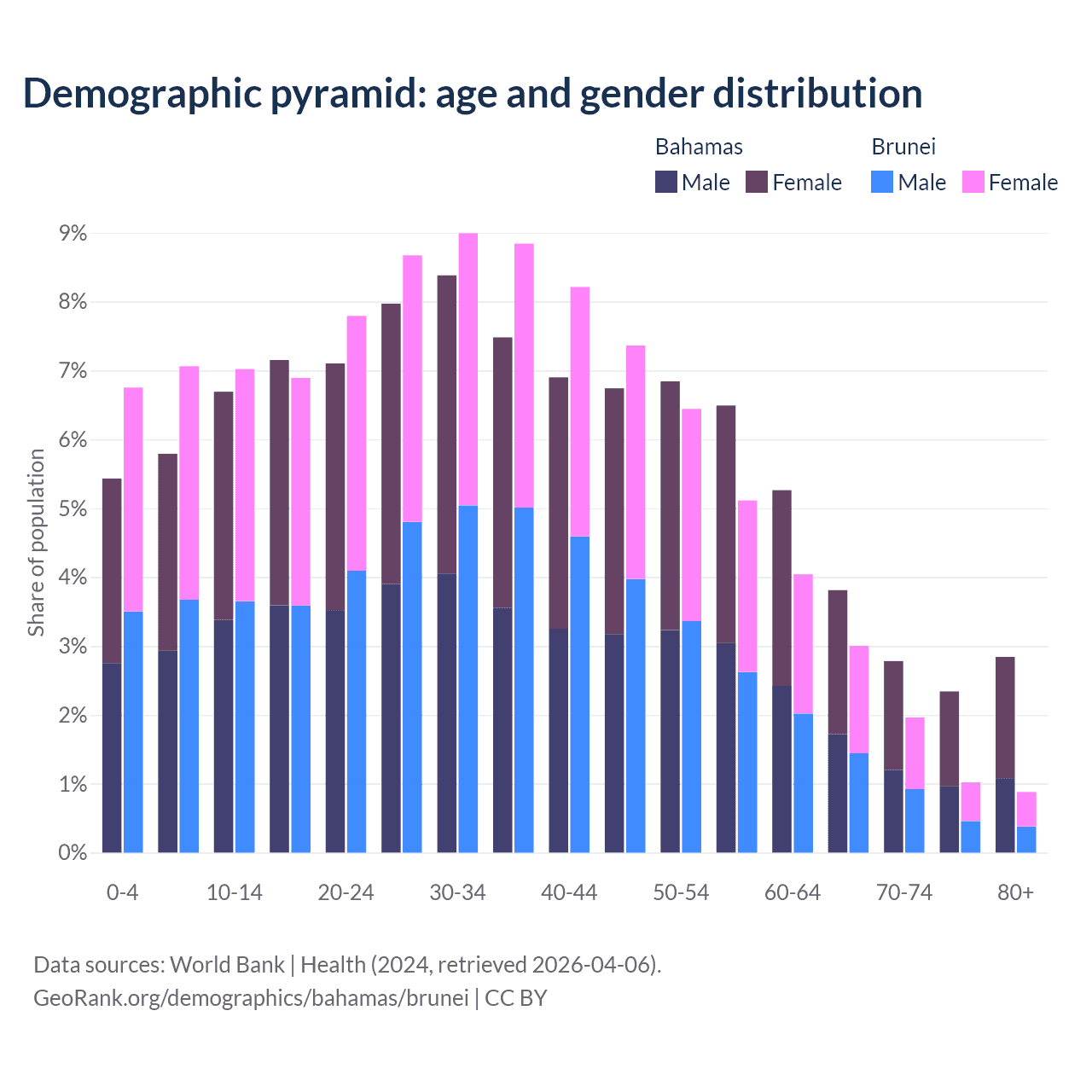 - The Bahamas is ranked 70/196 by median age (oldest to youngest) vs 88/196 for Brunei.