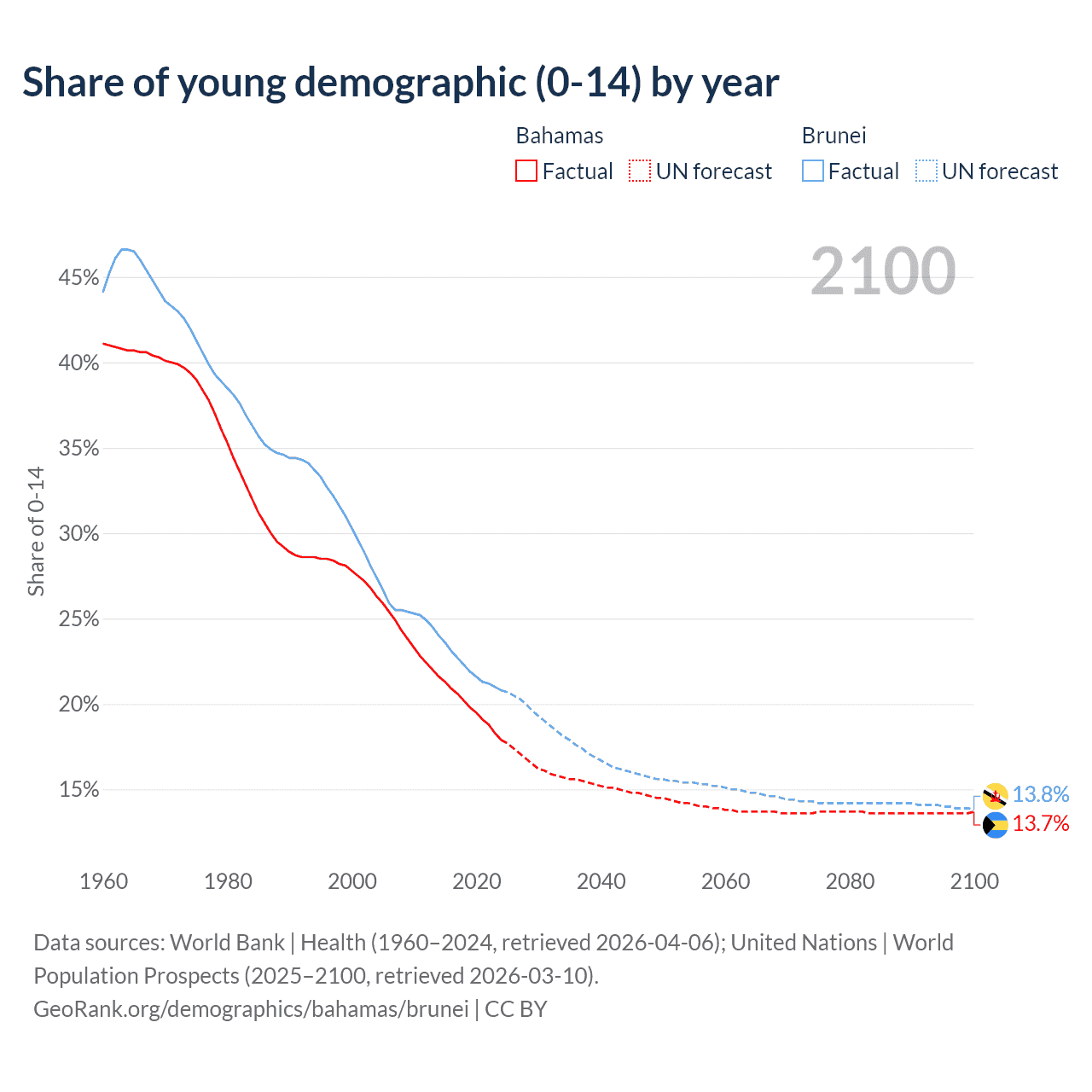 - The share of young demographic (0-15 years old) in the Bahamas is 17.9% vs 20.8% in Brunei.