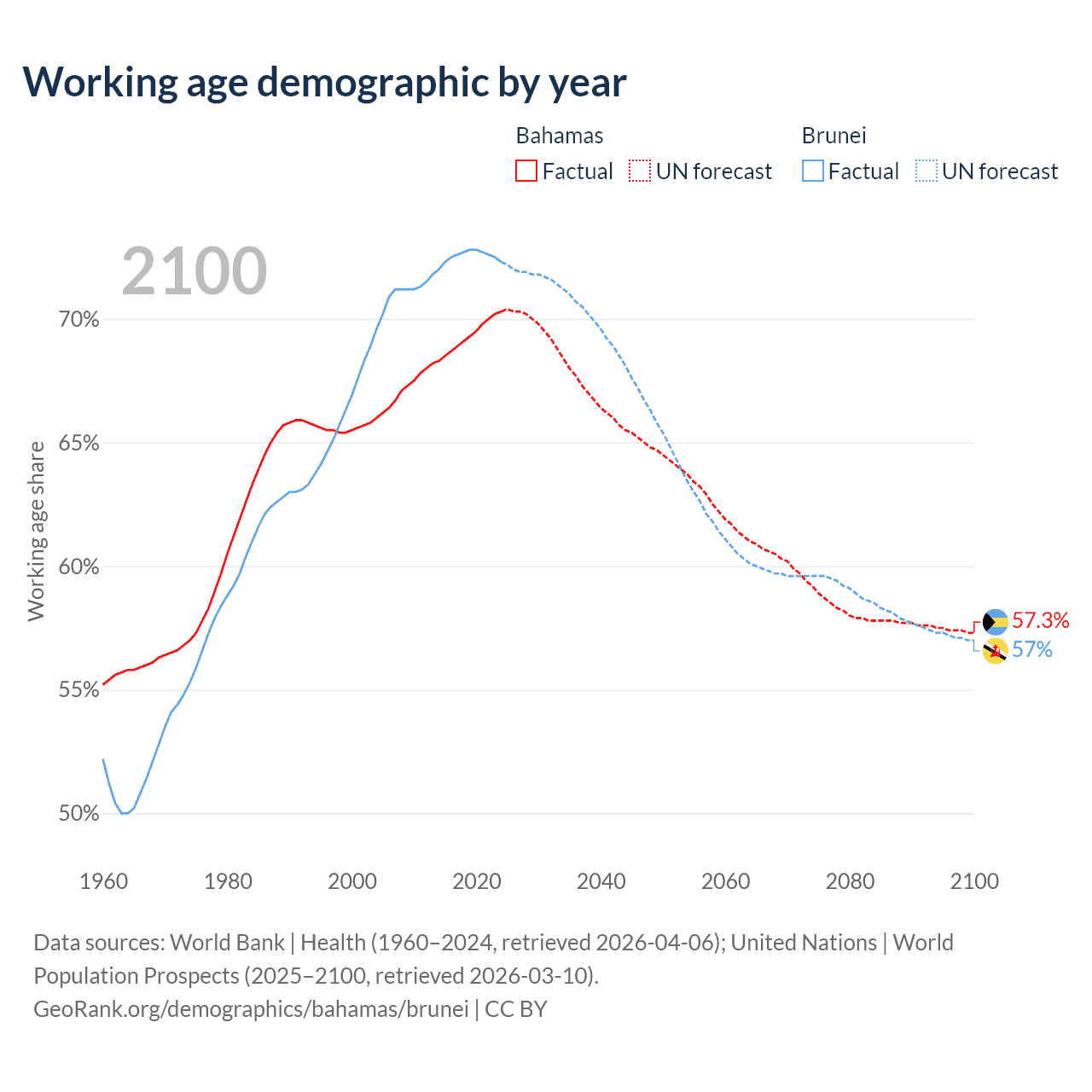 - The Bahamas has 285K working age adults (aged 15-64) vs 340K in Brunei.