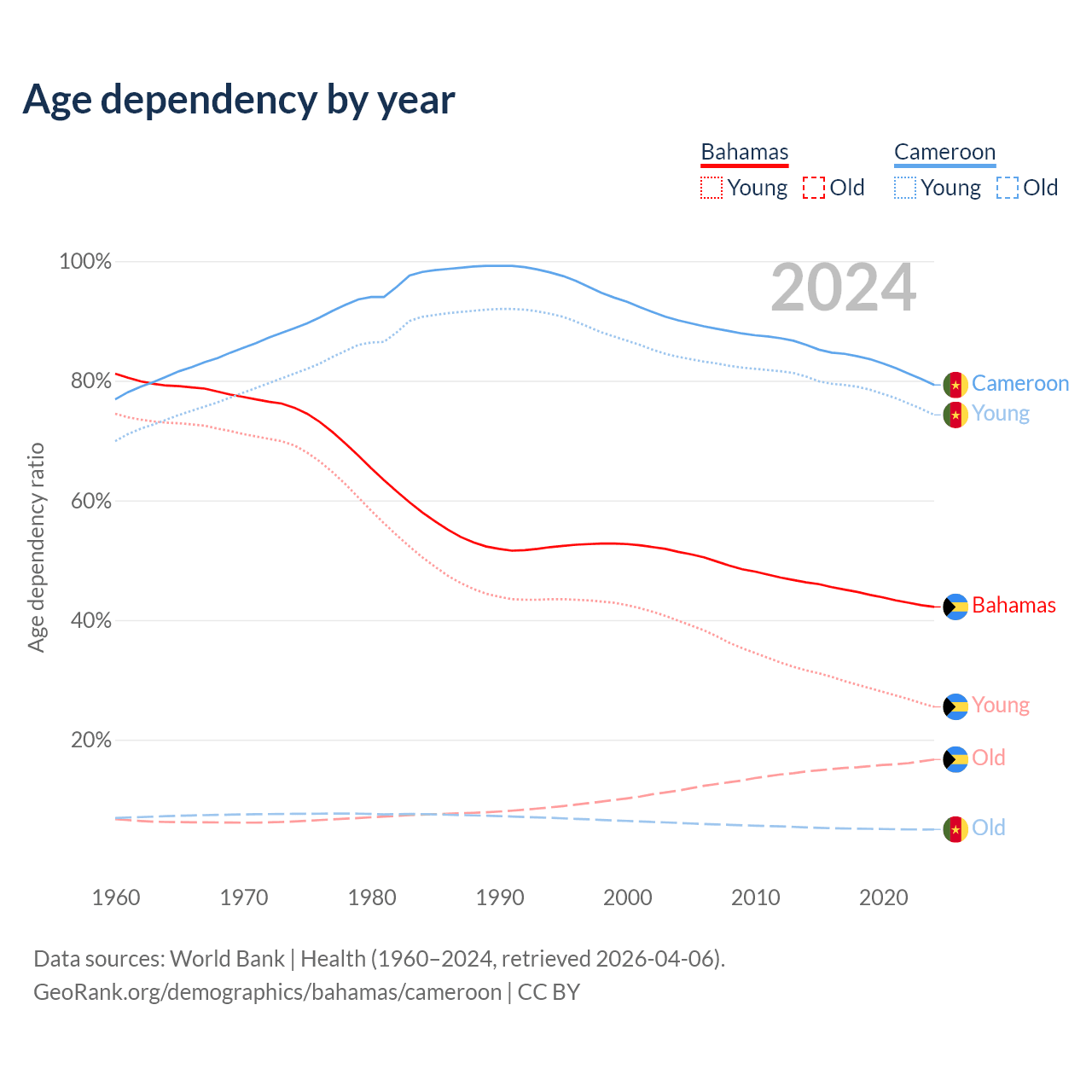 - The share of old-age demographic (65+) in the Bahamas is 11.8% vs 2.79% in Cameroon.