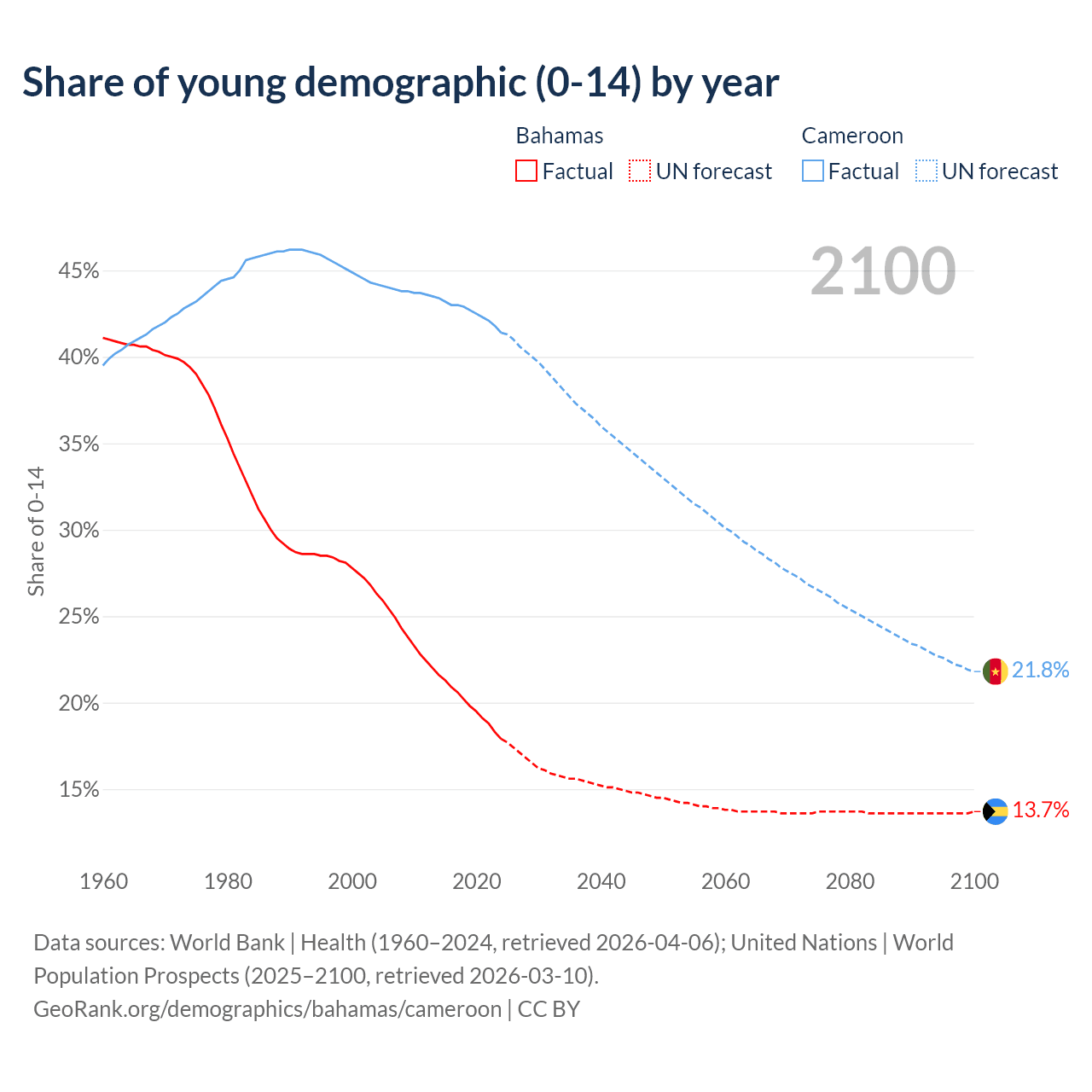 - The share of young demographic (0-15 years old) in the Bahamas is 17.9% vs 41.4% in Cameroon.