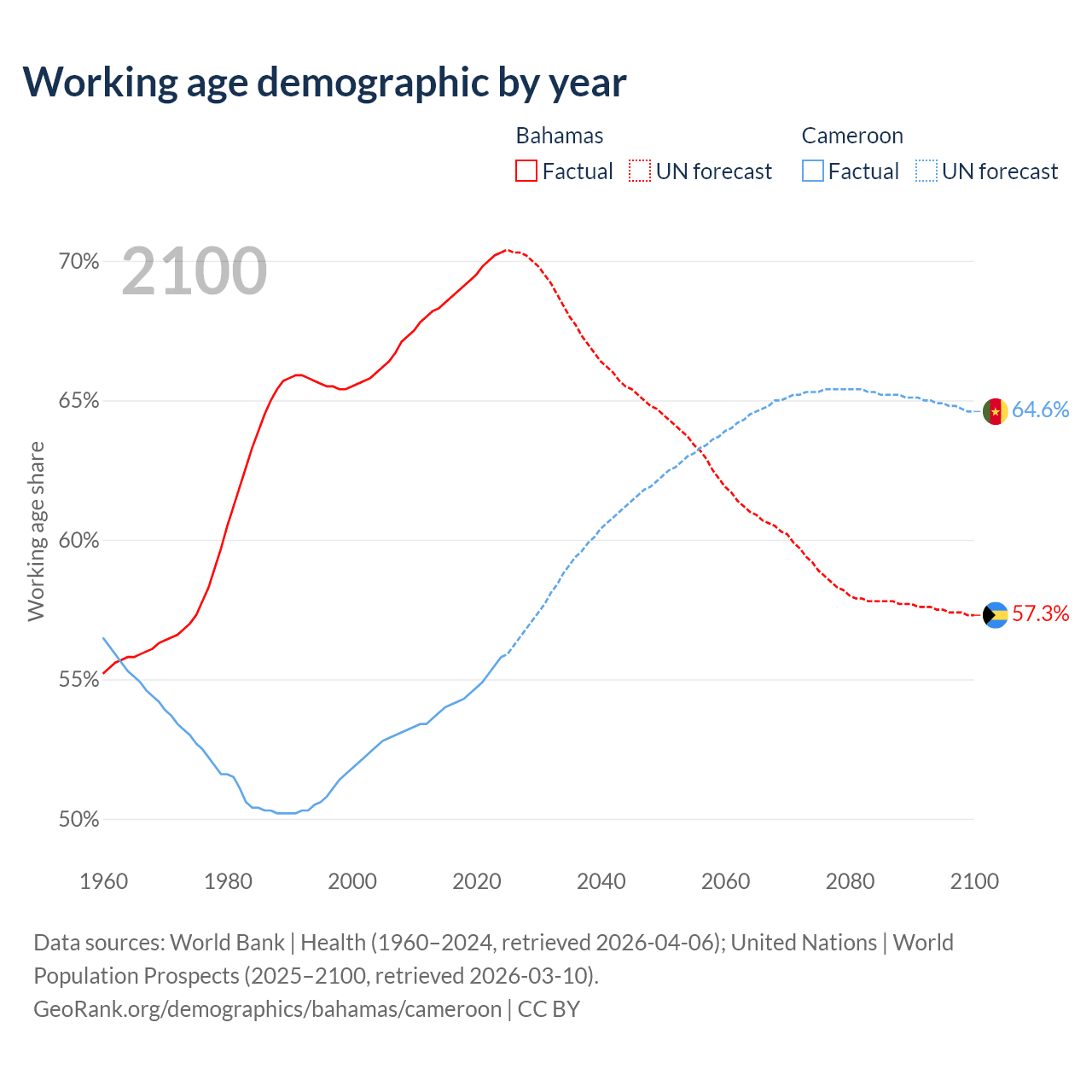 - The Bahamas has 285K working age adults (aged 15-64) vs 17.2M in Cameroon.