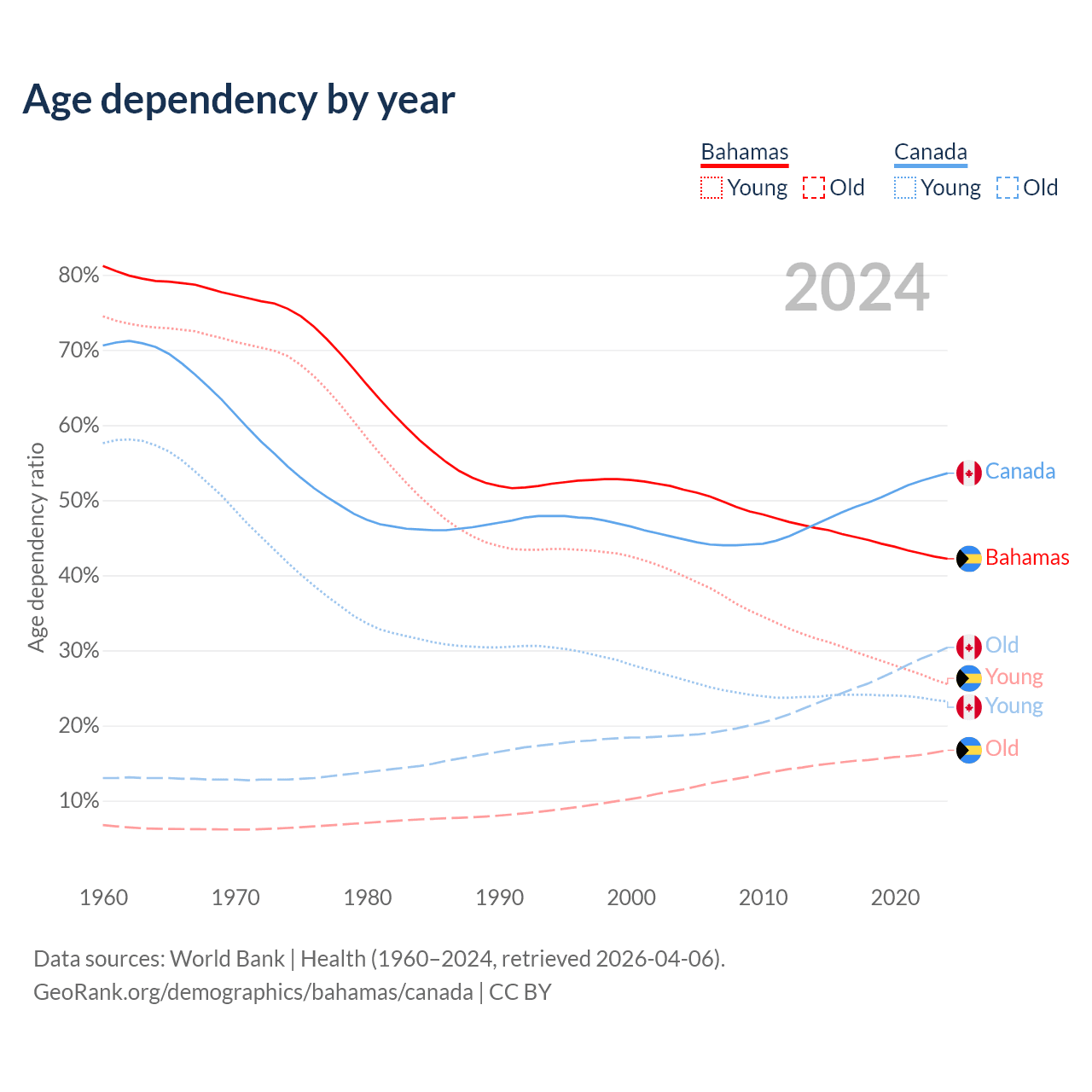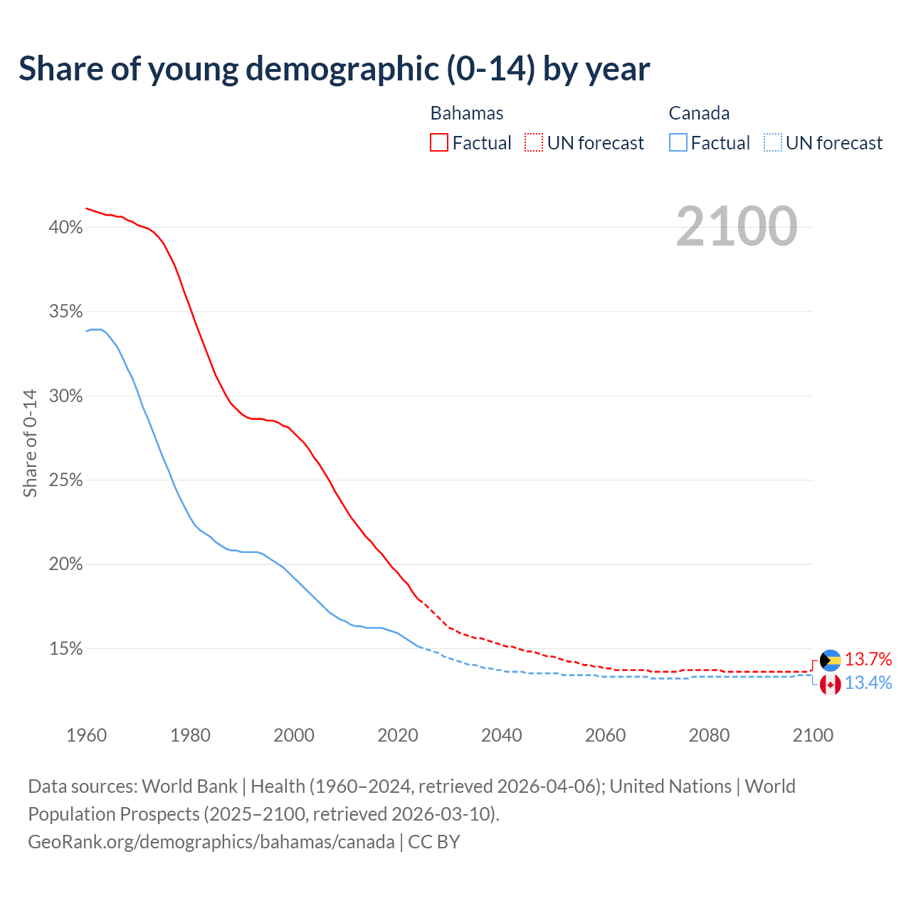 - The share of young demographic (0-15 years old) in the Bahamas is 17.9% vs 15.1% in Canada.