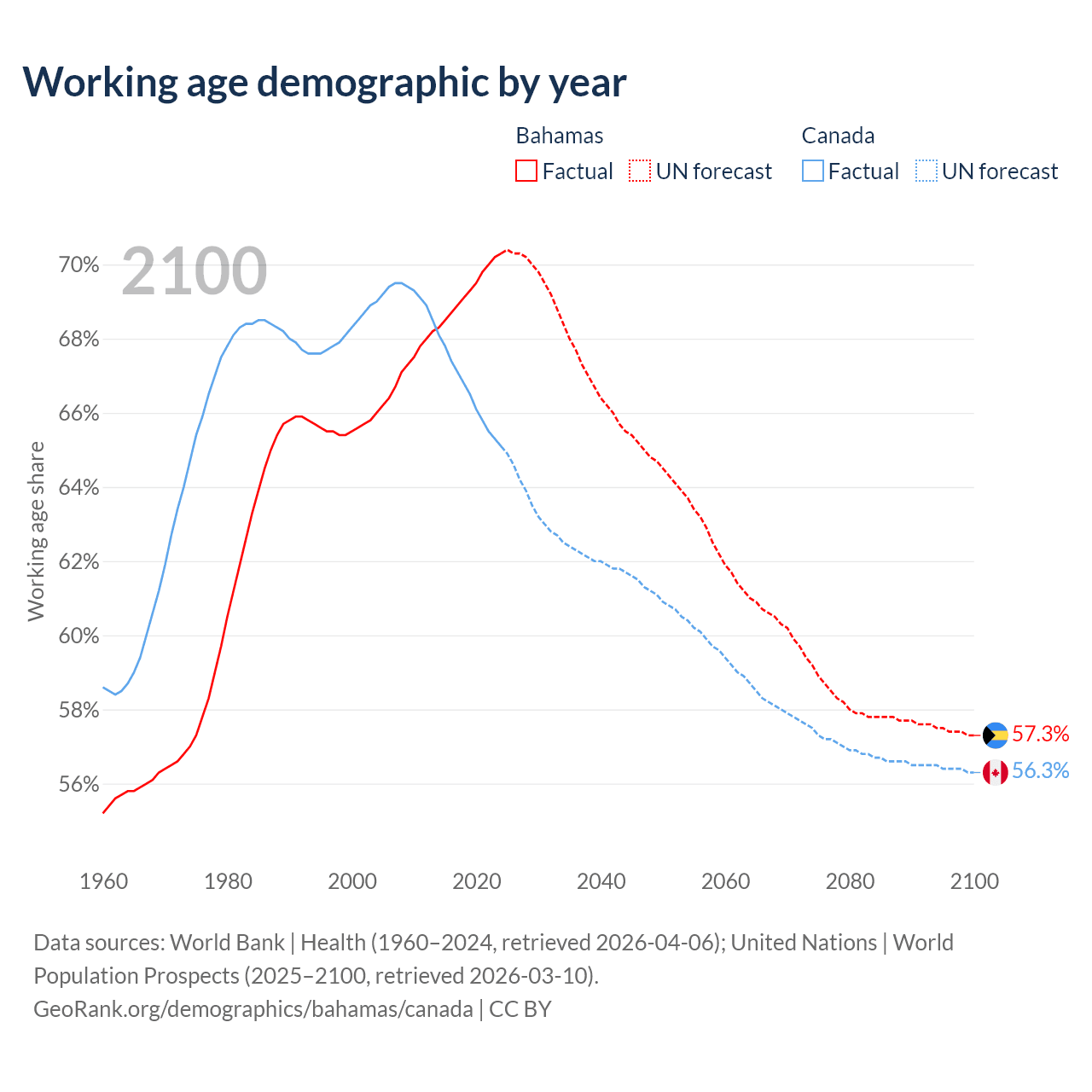 - The Bahamas has 285K working age adults (aged 15-64) vs 27.5M in Canada.