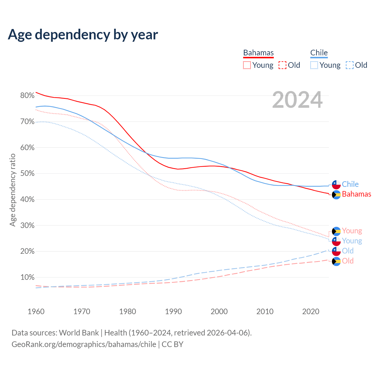 - The Bahamas is ranked 70/196 by median age (oldest to youngest) vs 61/196 for Chile.