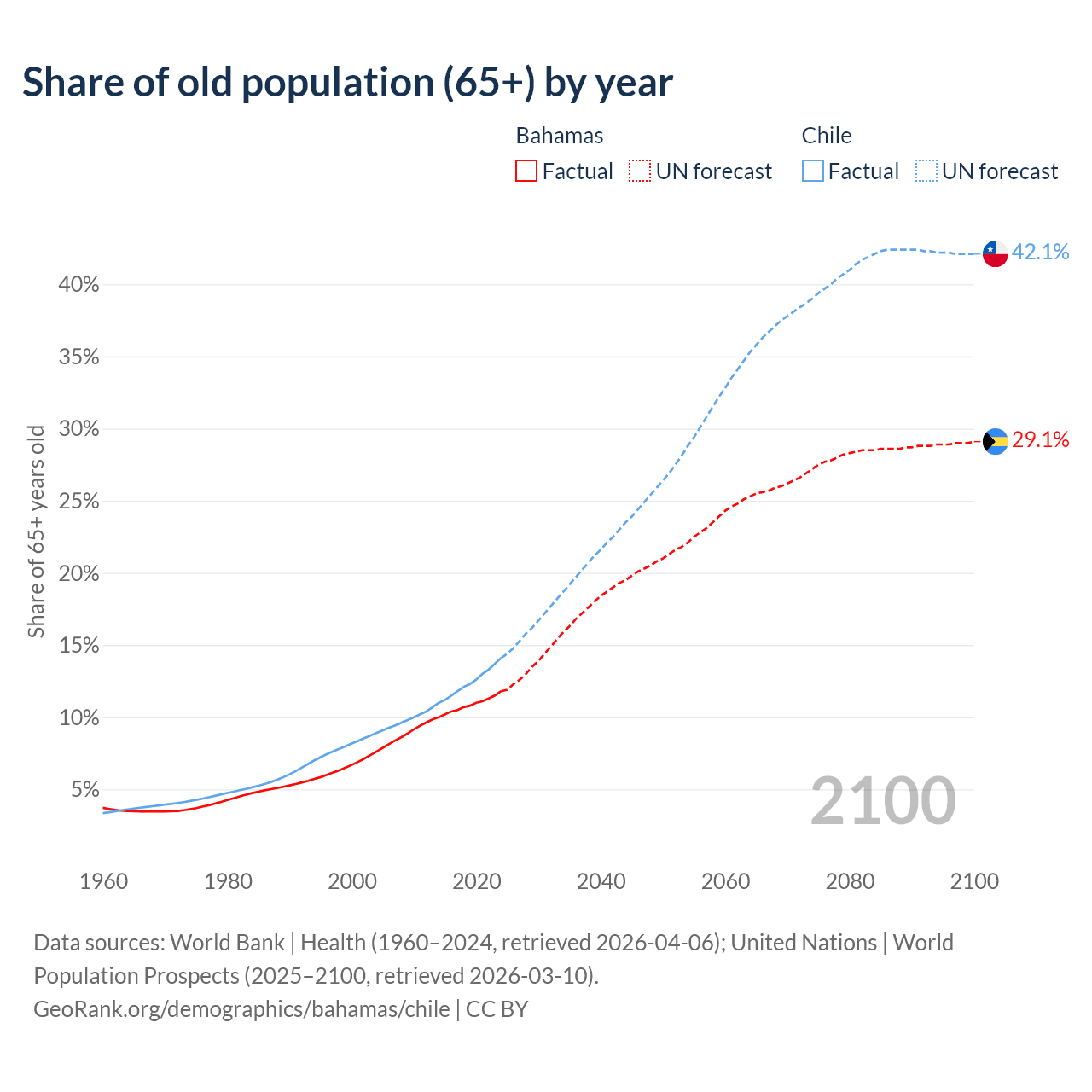 The share of older people aged 65 and over is 11.8% in the Bahamas and 14.1% in Chile. Life expectancy in the Bahamas compared to Chile .