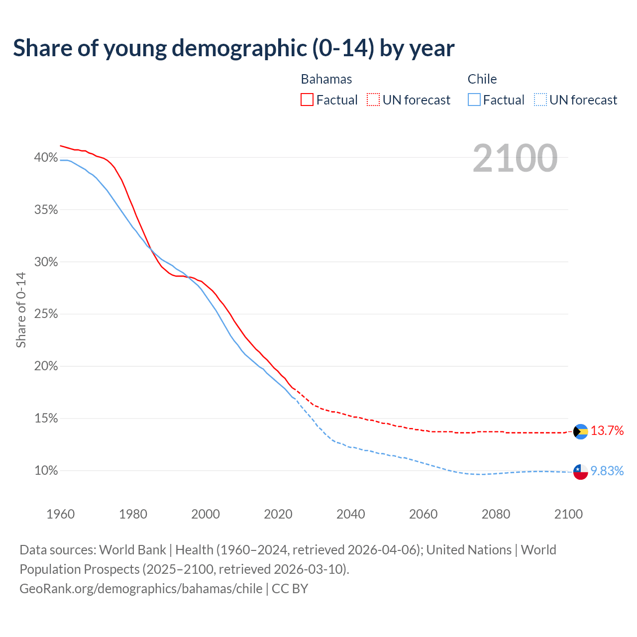 - The share of young demographic (0-15 years old) in the Bahamas is 17.9% vs 17% in Chile.