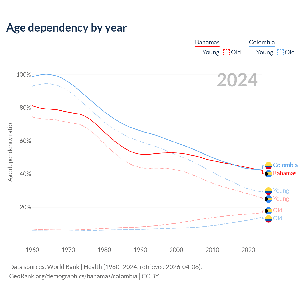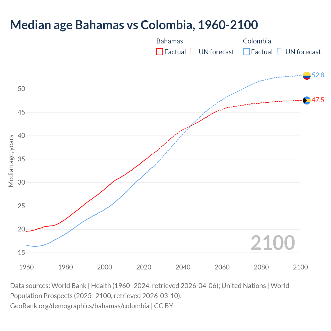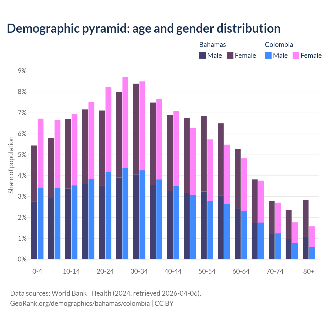 - The Bahamas is ranked 70/196 by median age (oldest to youngest) vs 89/196 for Colombia.
