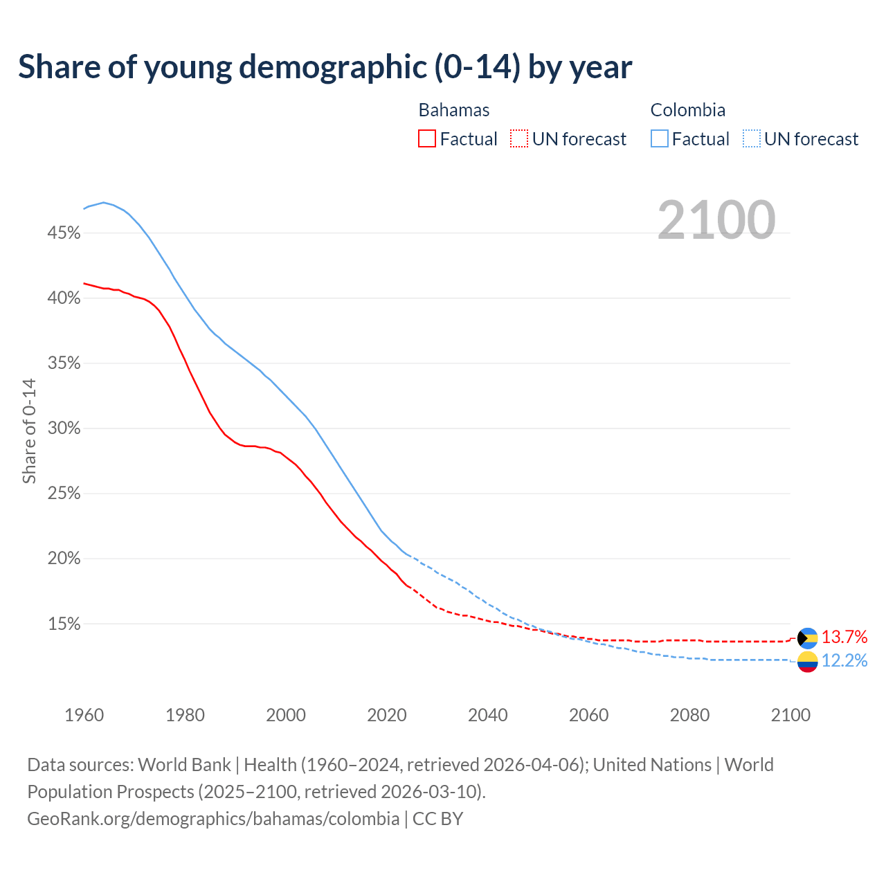 - The share of young demographic (0-15 years old) in the Bahamas is 17.9% vs 20.3% in Colombia.