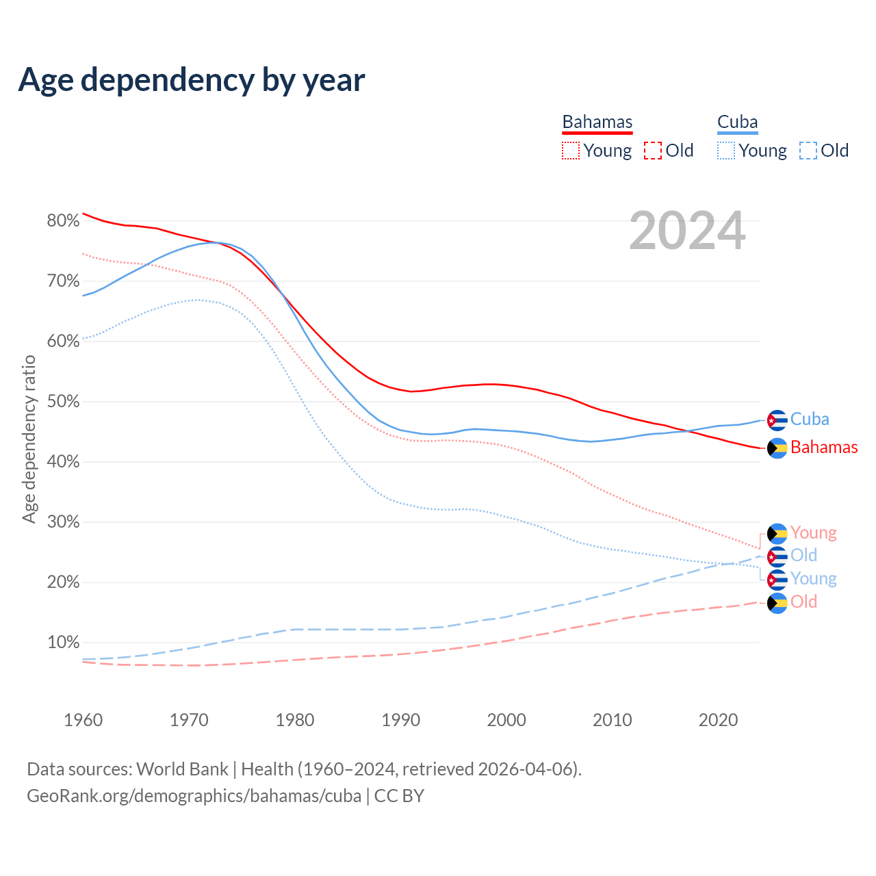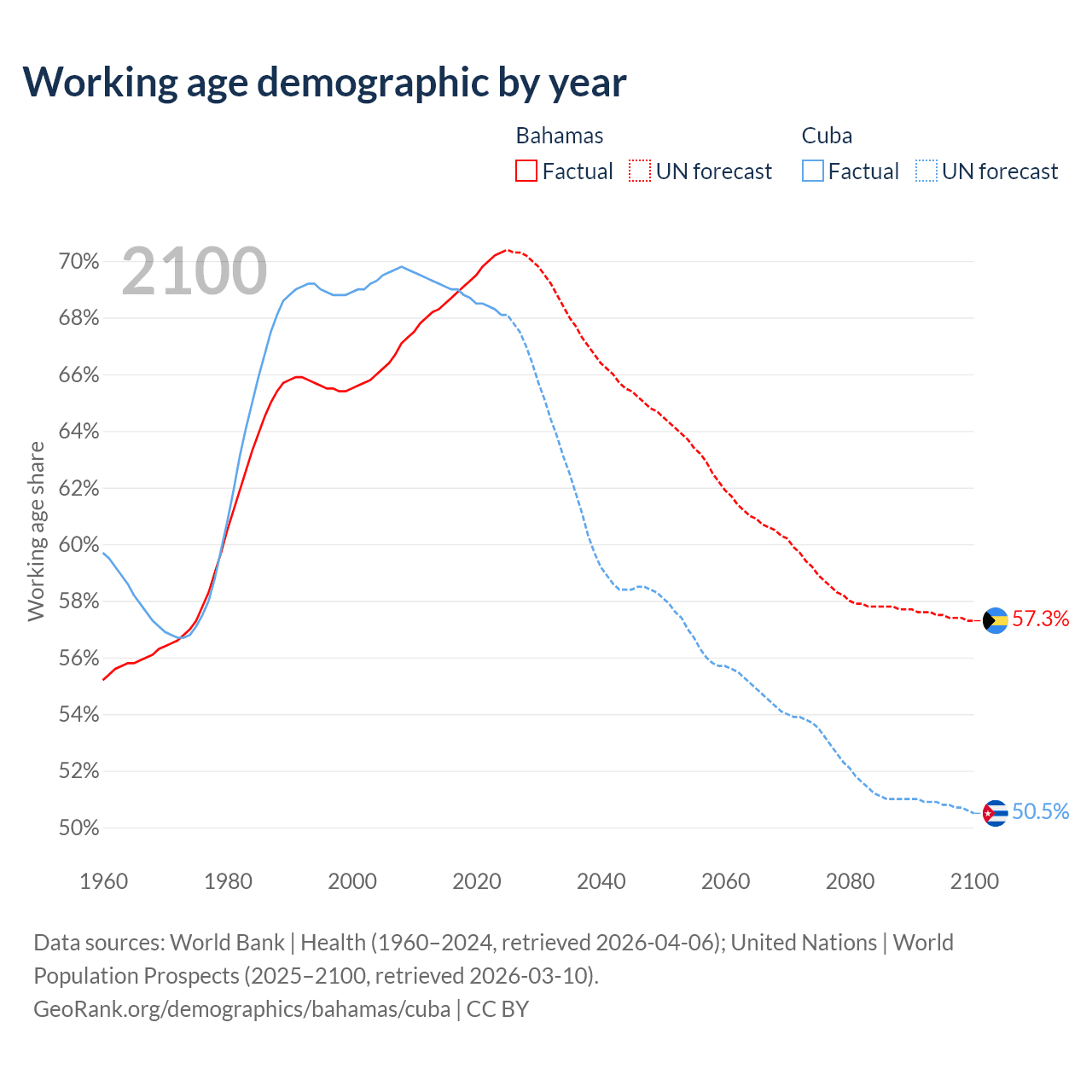 The share of older people aged 65 and over is 11.8% in the Bahamas and 16.6% in Cuba. Life expectancy in the Bahamas compared to Cuba .