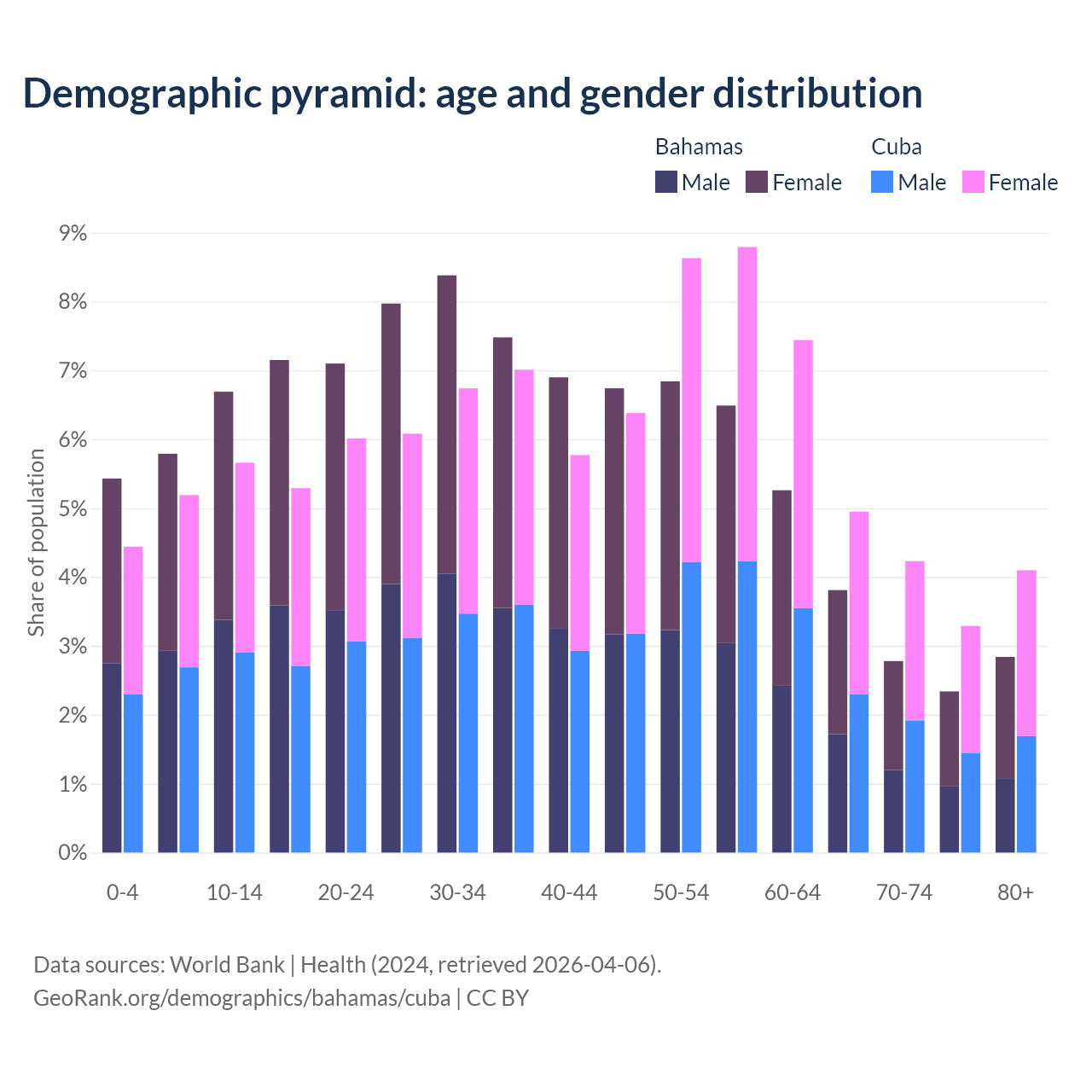 - The Bahamas is ranked 70/196 by median age (oldest to youngest) vs 27/196 for Cuba.