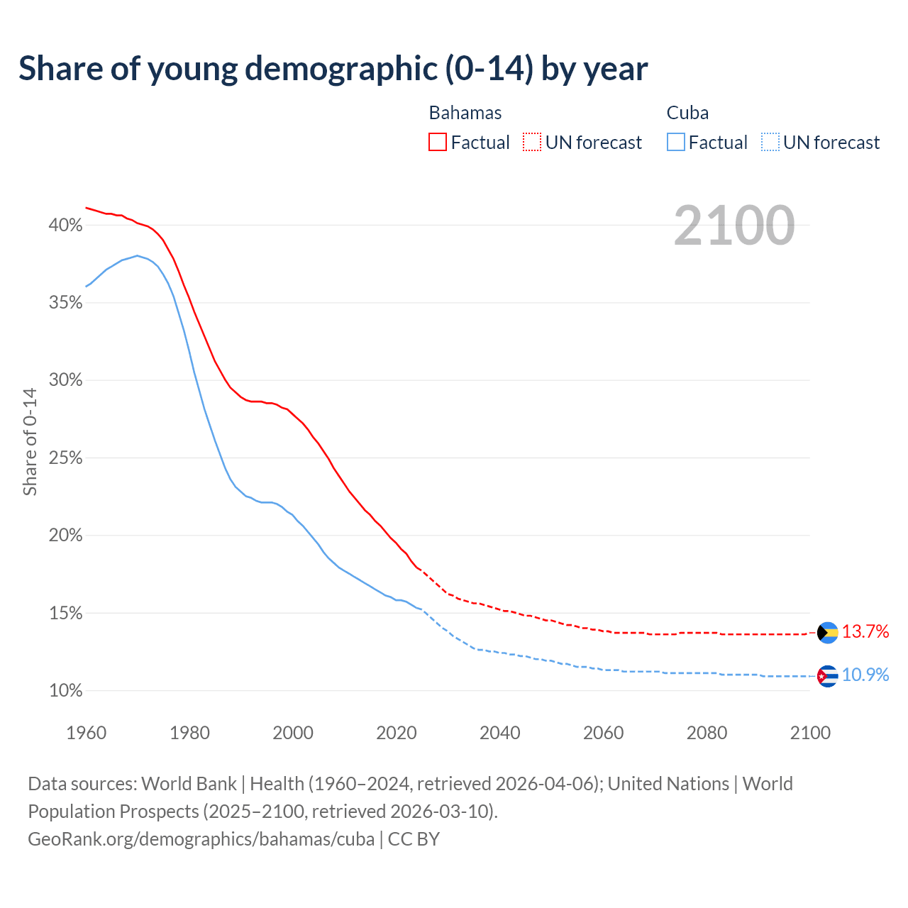 - As of 2026, the population of the Bahamas is 405K vs 10.9M in Cuba - 26.9 times difference.