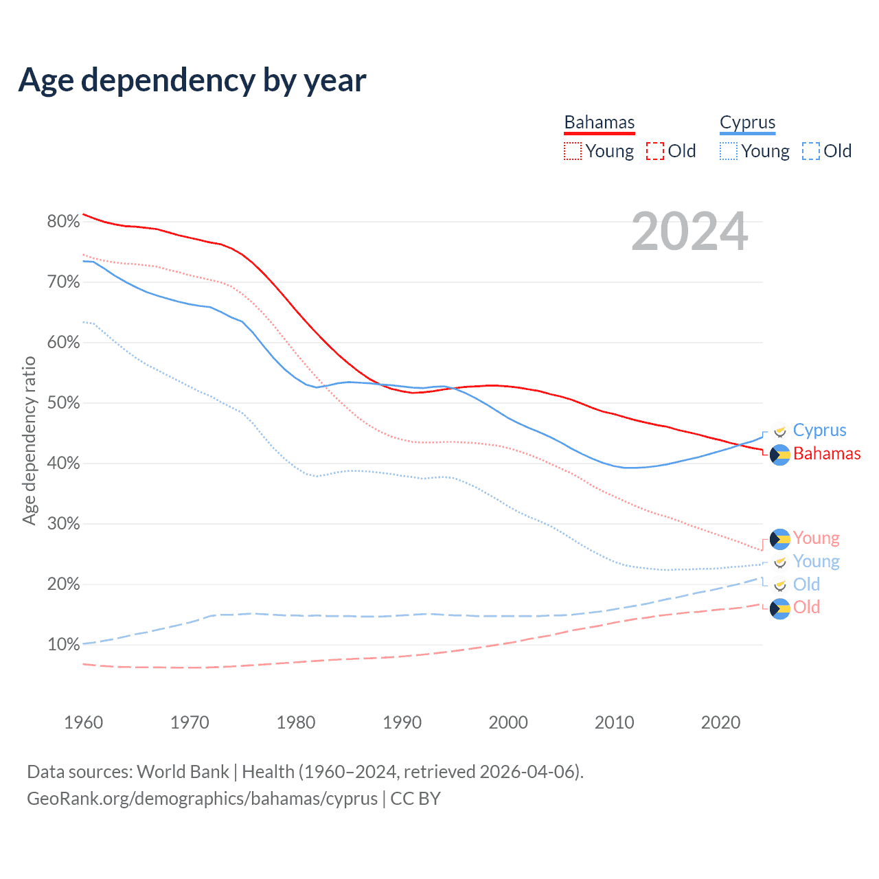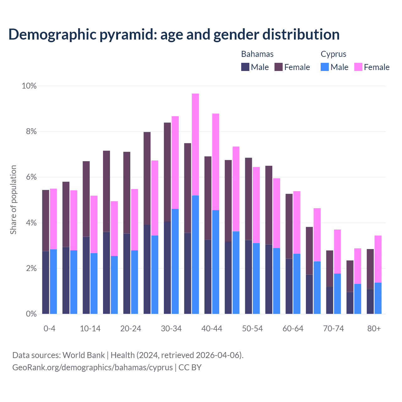 - The Bahamas is ranked 70/196 by median age (oldest to youngest) vs 52/196 for Cyprus.
