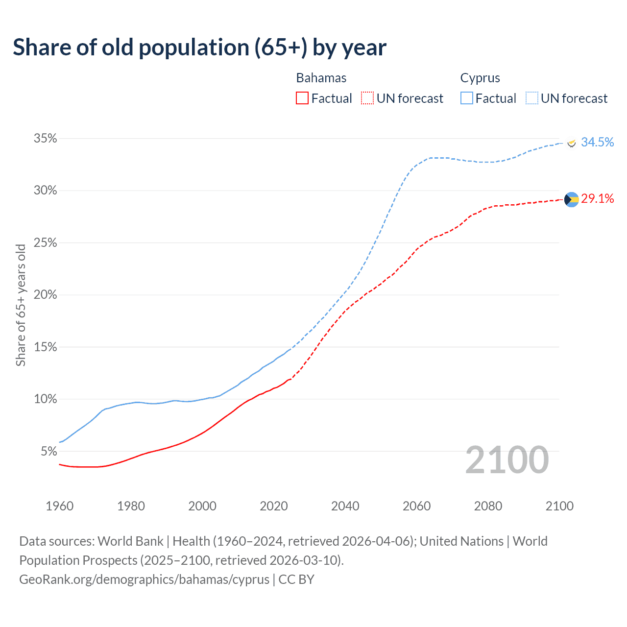 The share of older people aged 65 and over is 11.8% in the Bahamas and 14.6% in Cyprus. Life expectancy in the Bahamas compared to Cyprus .