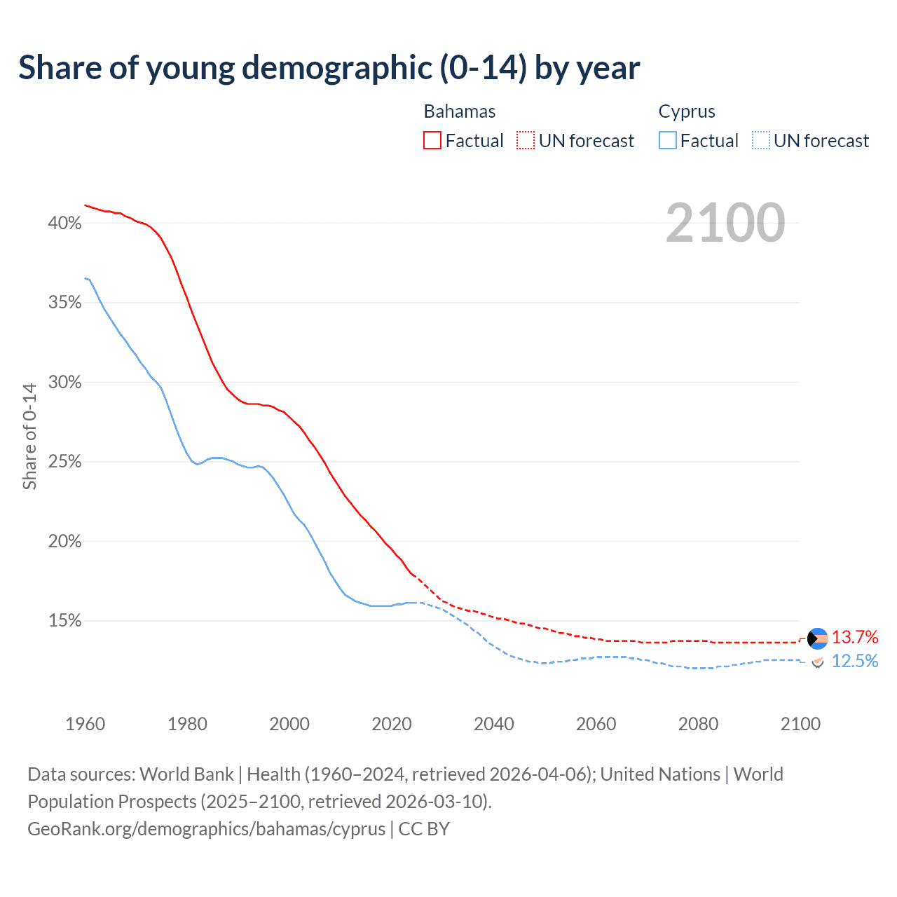 - The share of young demographic (0-15 years old) in the Bahamas is 17.9% vs 16.1% in Cyprus.