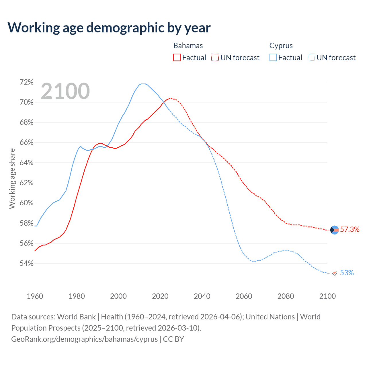 - The Bahamas has 285K working age adults (aged 15-64) vs 961K in Cyprus.