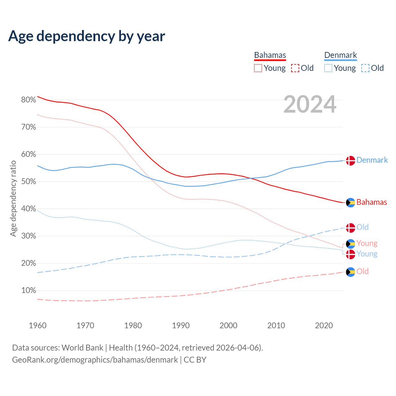 - The Bahamas is ranked 70/196 by median age (oldest to youngest) vs 34/196 for Denmark.