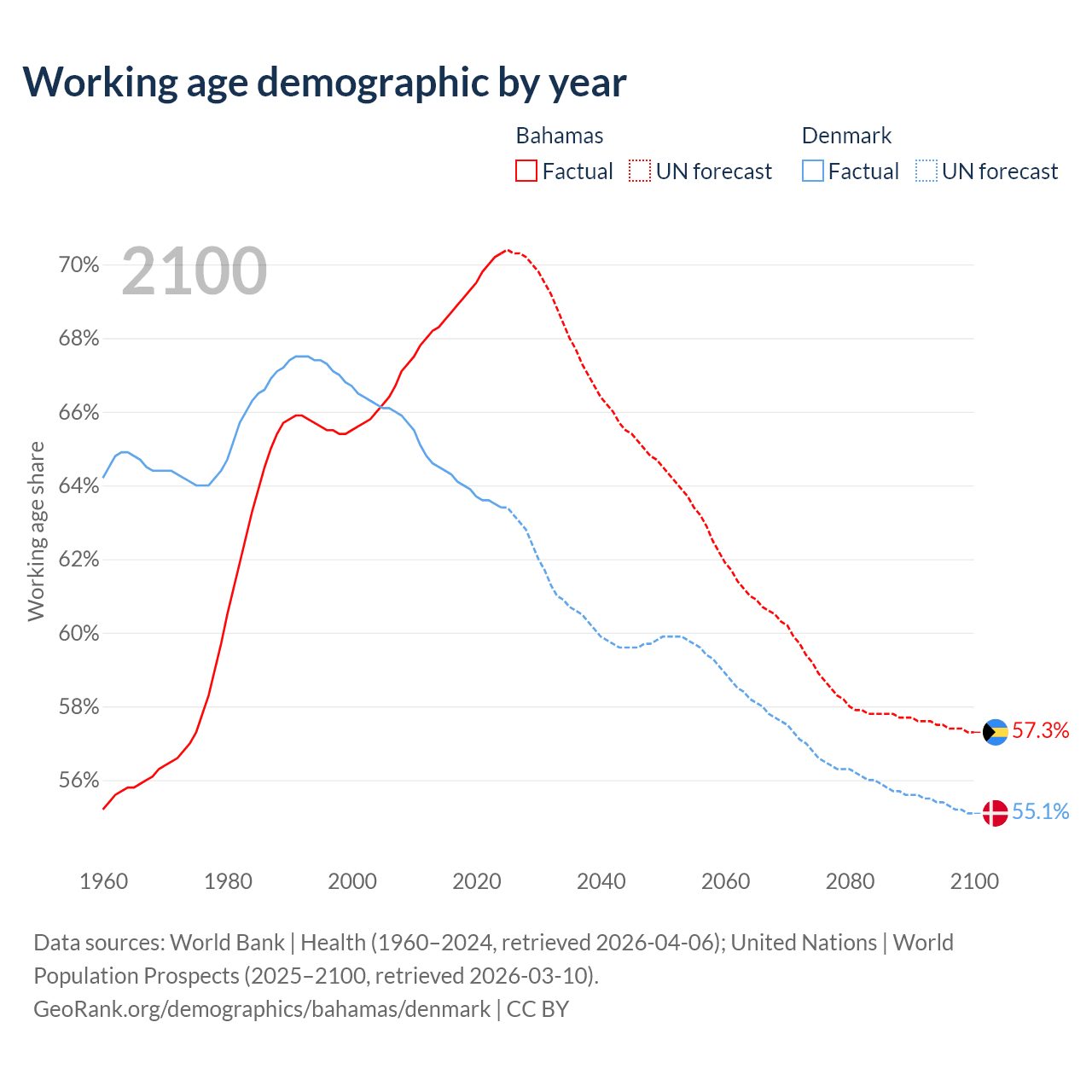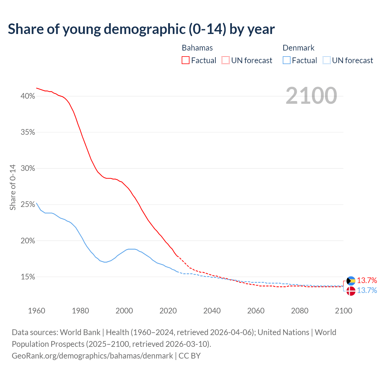 - The share of young demographic (0-15 years old) in the Bahamas is 17.9% vs 15.7% in Denmark.