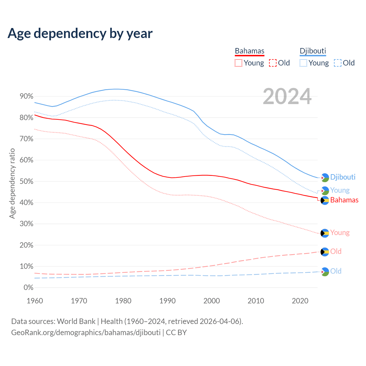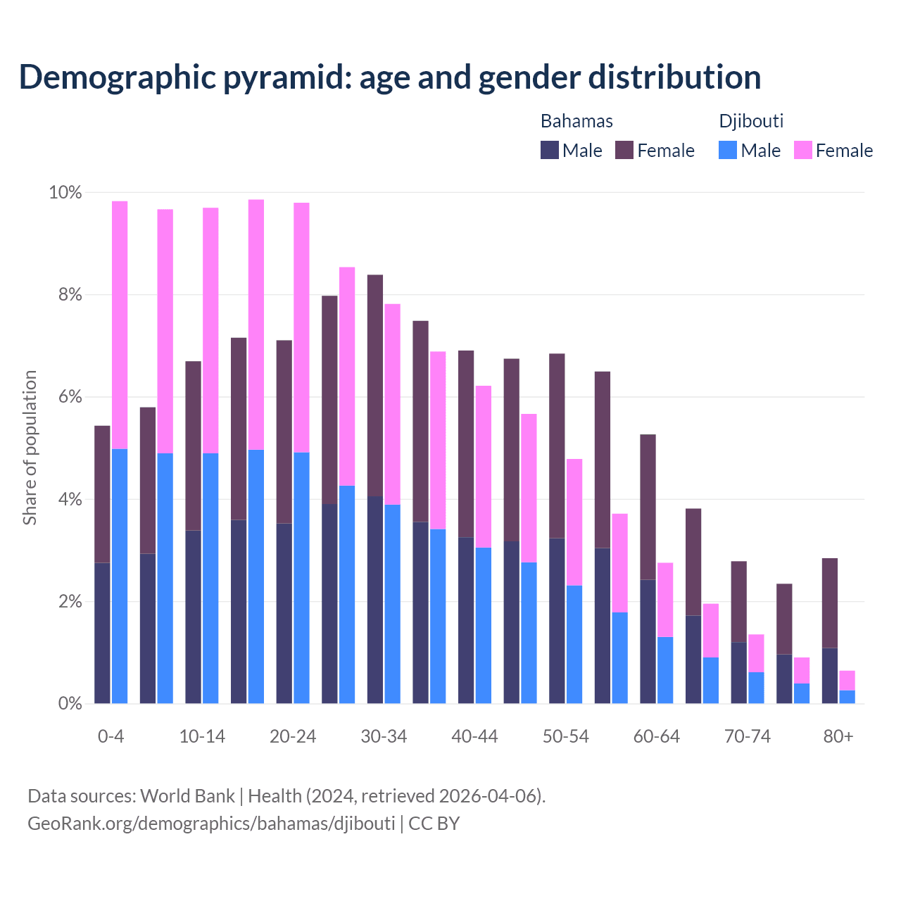 - The Bahamas is ranked 70/196 by median age (oldest to youngest) vs 129/196 for Djibouti.