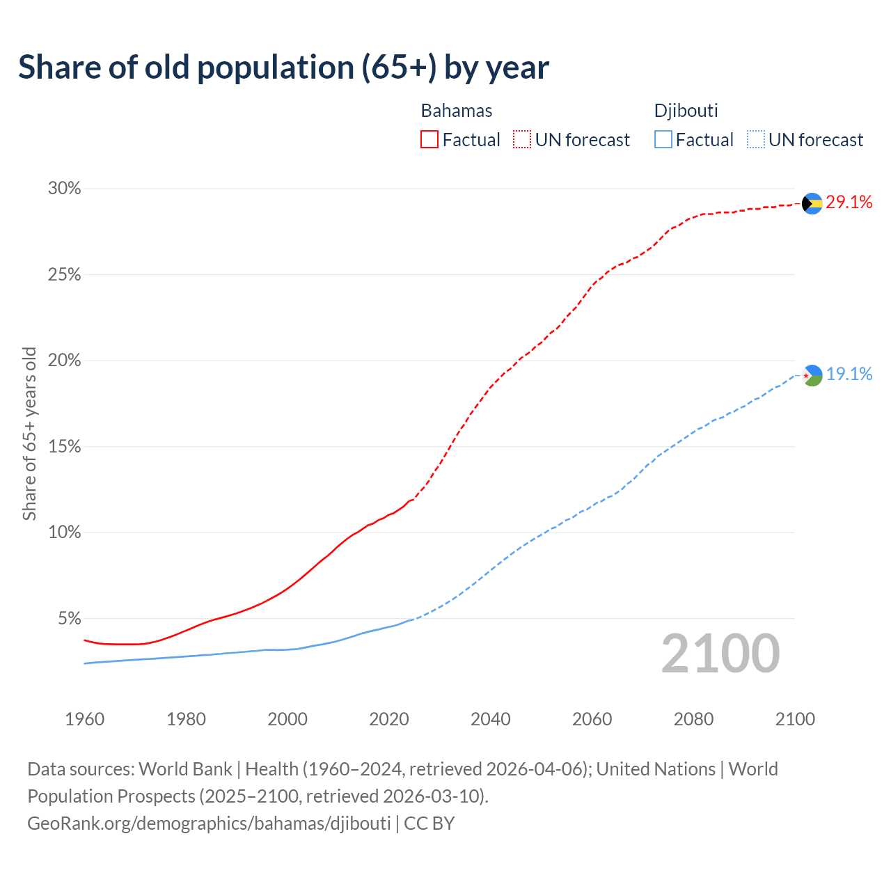 - The share of old-age demographic (65+) in the Bahamas is 11.8% vs 4.85% in Djibouti.