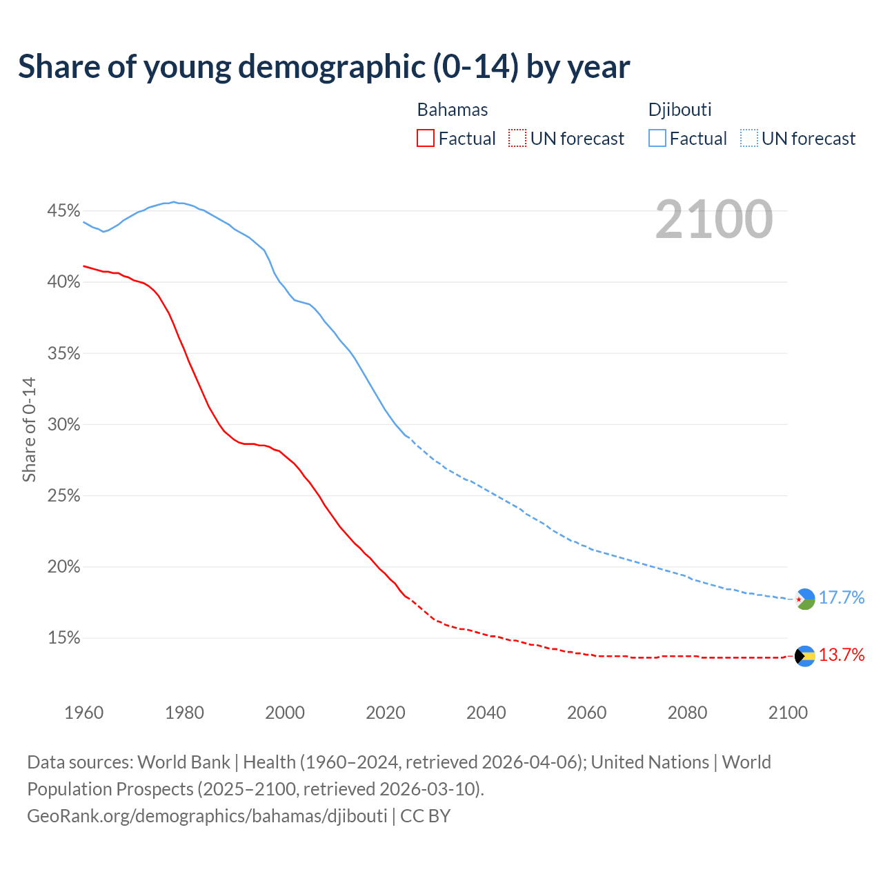 - The share of young demographic (0-15 years old) in the Bahamas is 17.9% vs 29.2% in Djibouti.