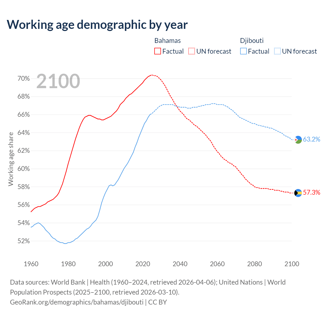 - The Bahamas has 285K working age adults (aged 15-64) vs 794K in Djibouti.