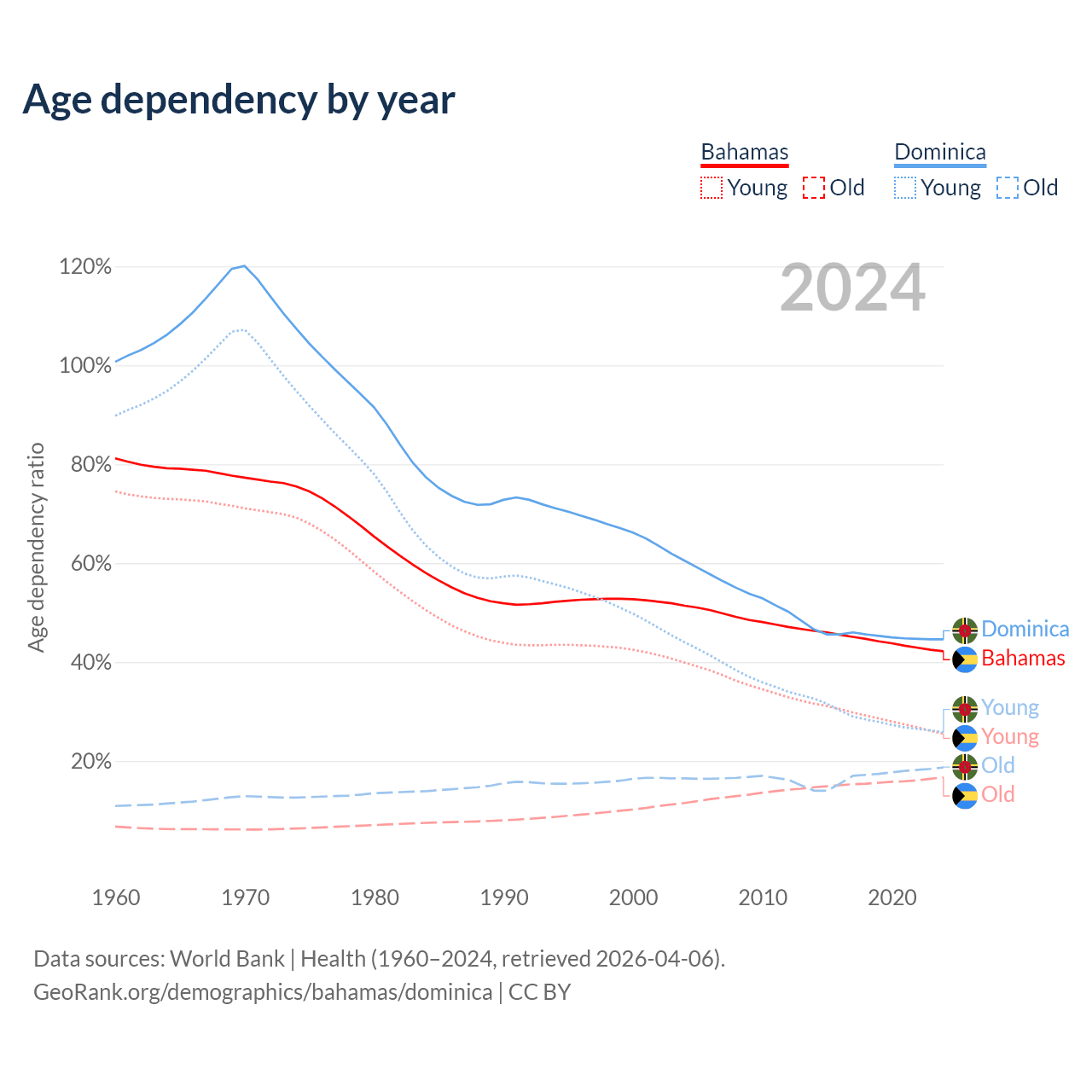 - The Bahamas is ranked 70/196 by median age (oldest to youngest) vs 66/196 for Dominica.