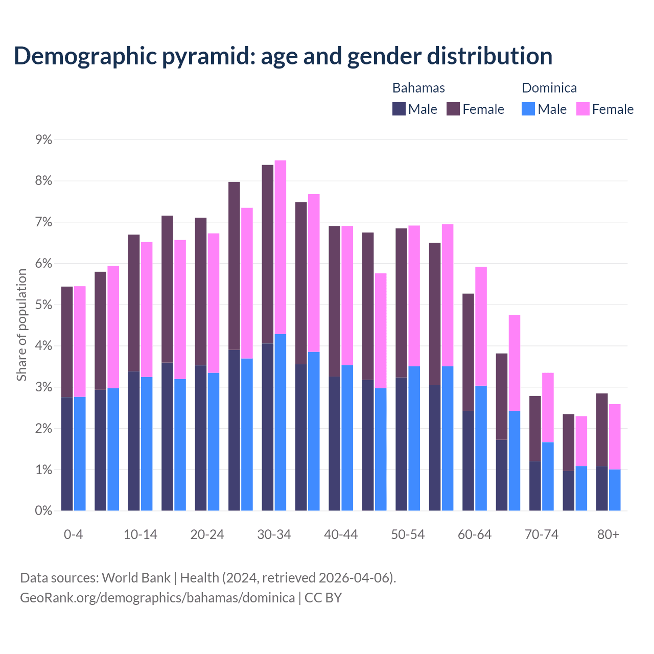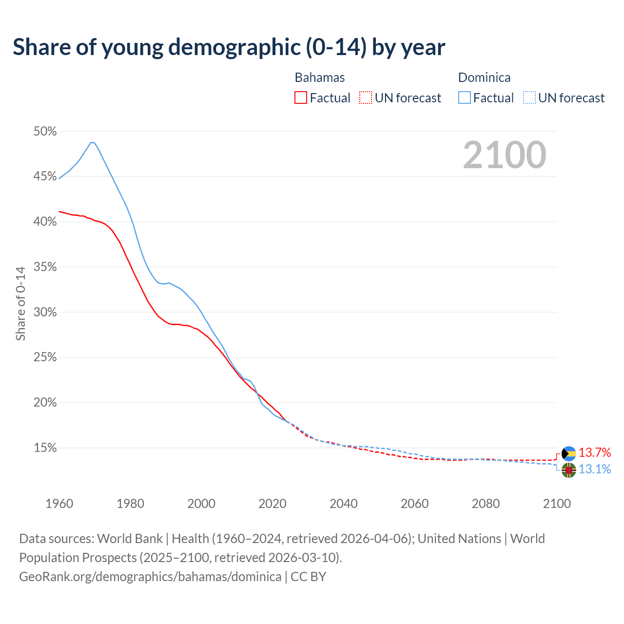 - The share of young demographic (0-15 years old) in the Bahamas is 17.9% vs 17.9% in Dominica.
