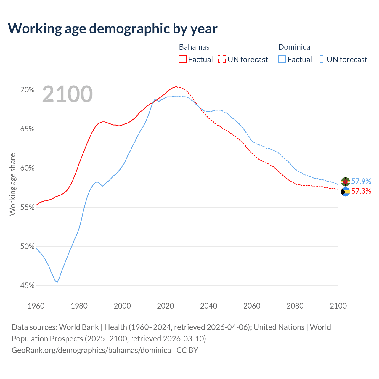 - The Bahamas has 285K working age adults (aged 15-64) vs 45.3K in Dominica.