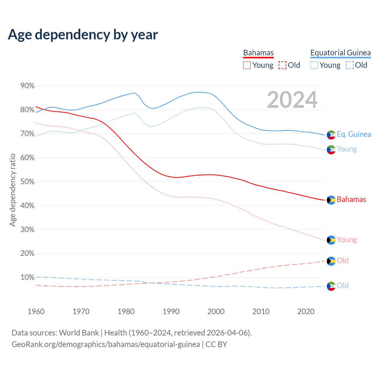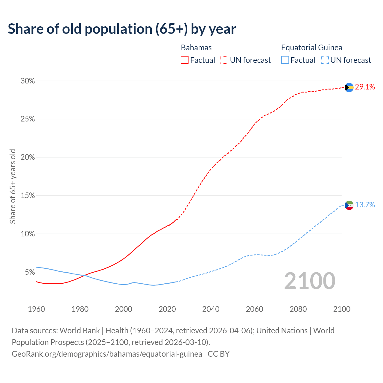 - The share of old-age demographic (65+) in the Bahamas is 11.8% vs 3.69% in Equatorial Guinea.