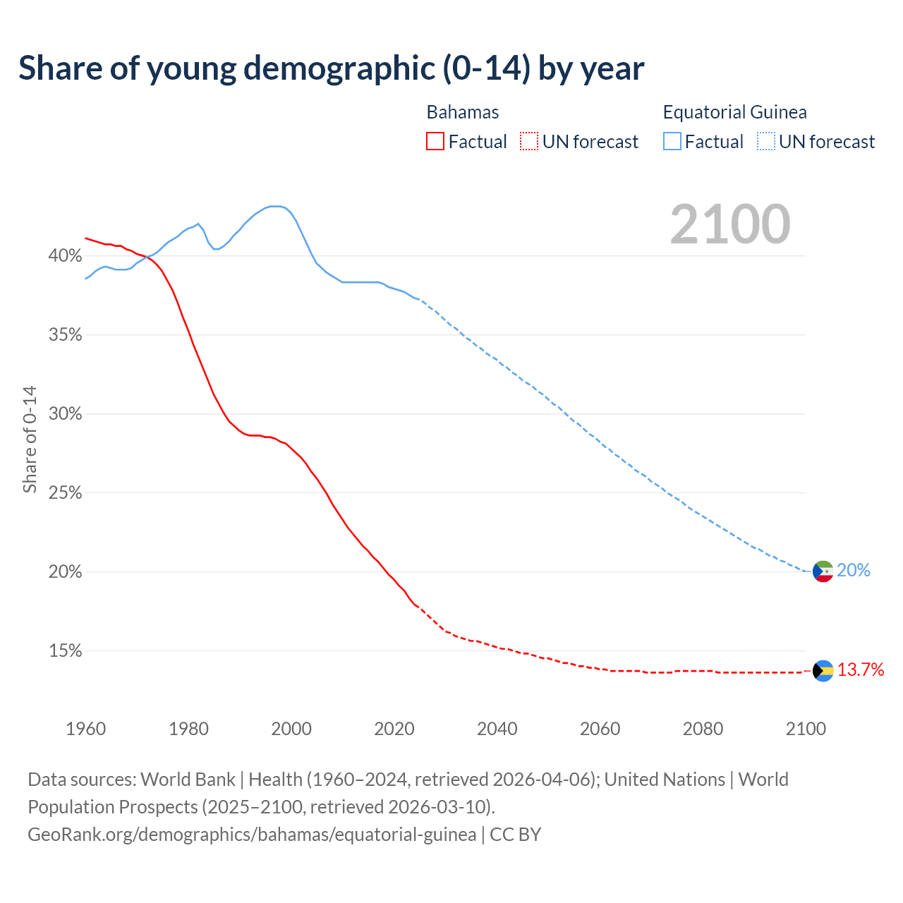 - The share of young demographic (0-15 years old) in the Bahamas is 17.9% vs 37.3% in Equatorial Guinea.