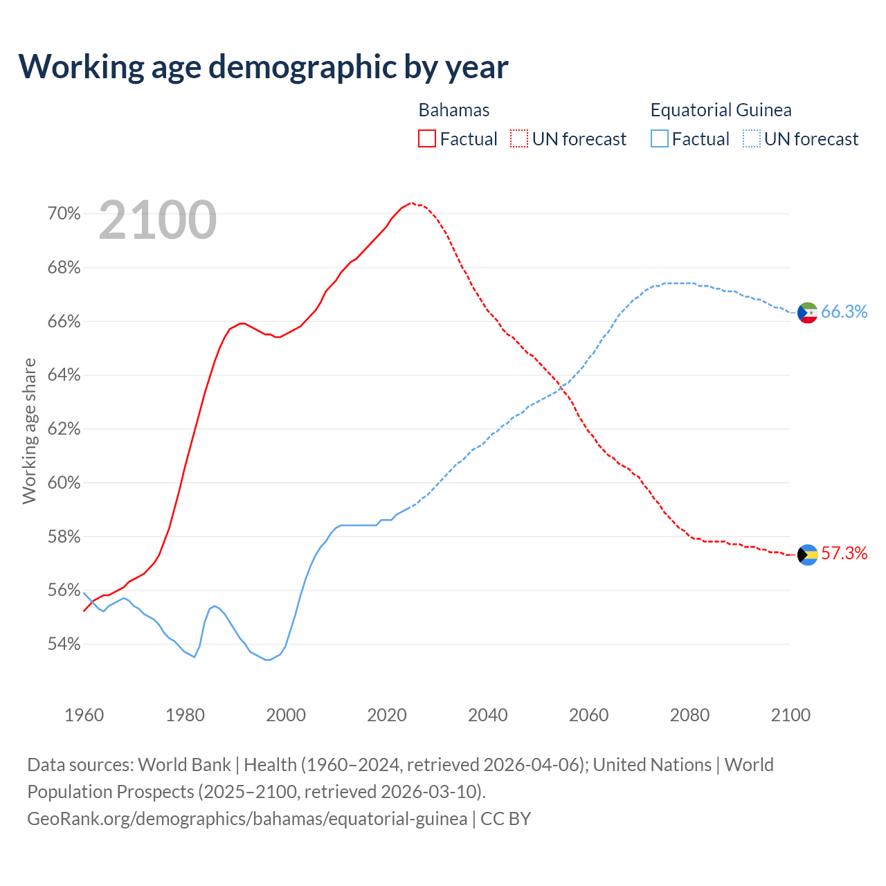 - The Bahamas has 285K working age adults (aged 15-64) vs 1.18M in Equatorial Guinea.
