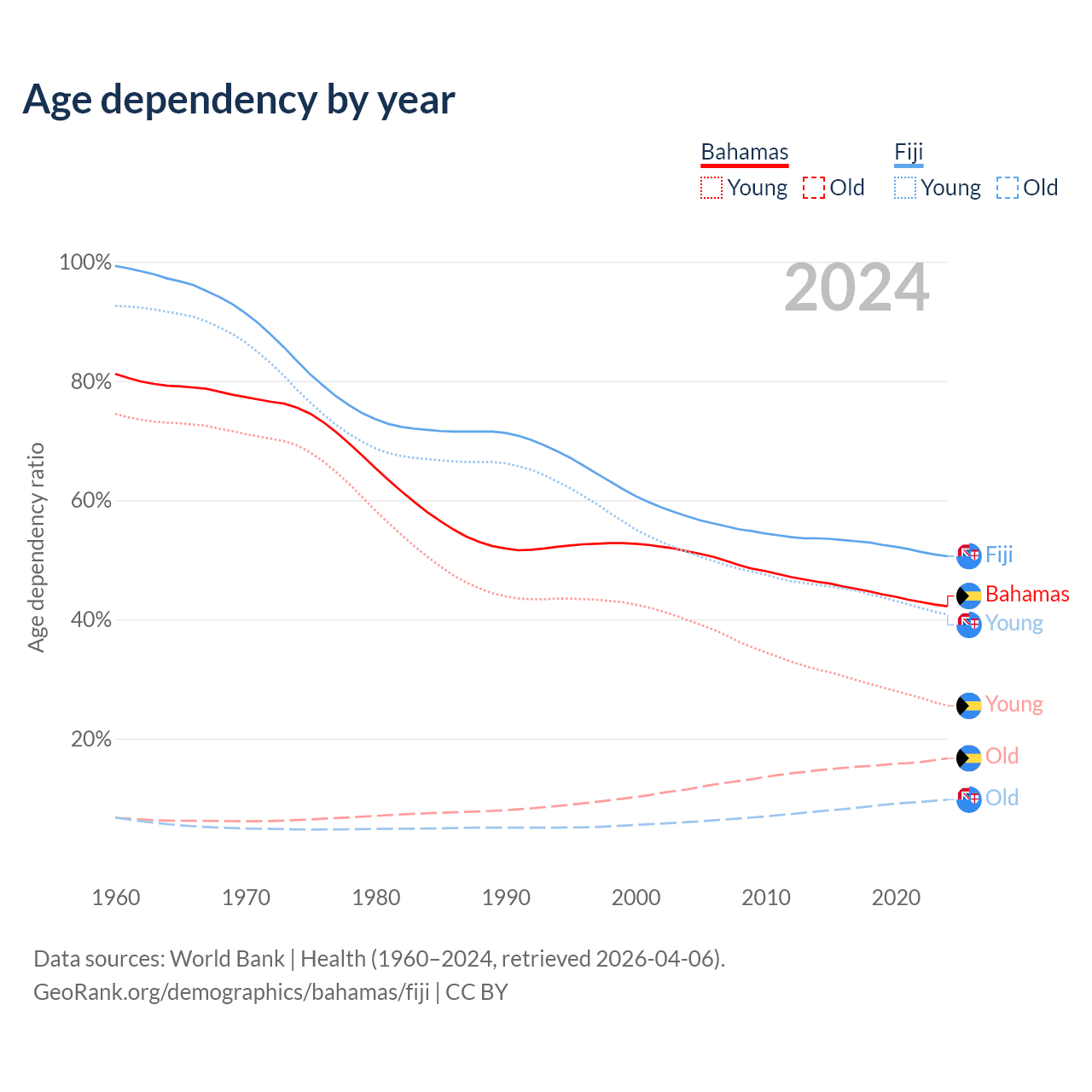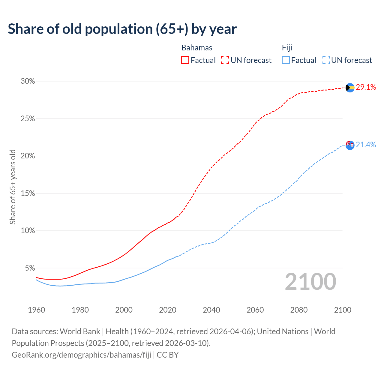 - The share of old-age demographic (65+) in the Bahamas is 11.8% vs 6.49% in Fiji.