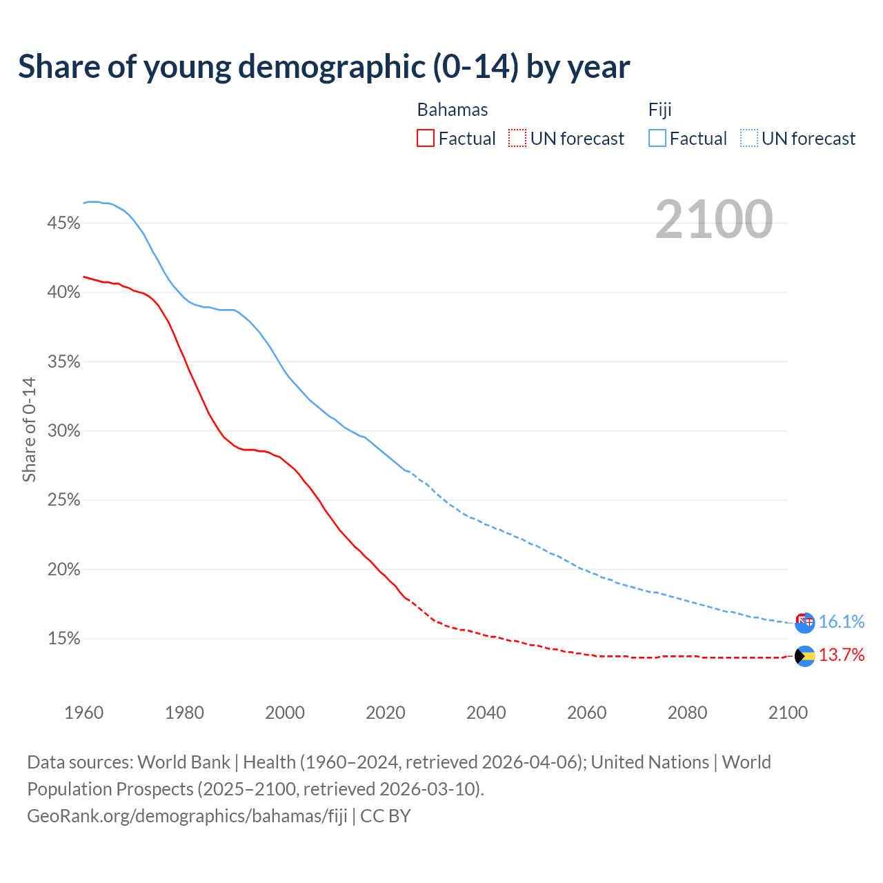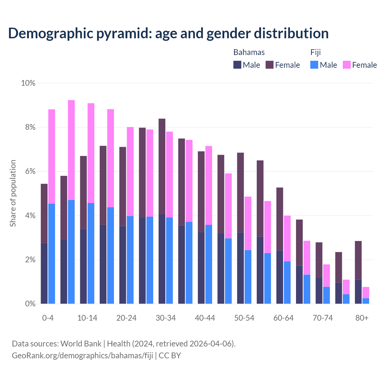 - The share of young demographic (0-15 years old) in the Bahamas is 17.9% vs 27.1% in Fiji.