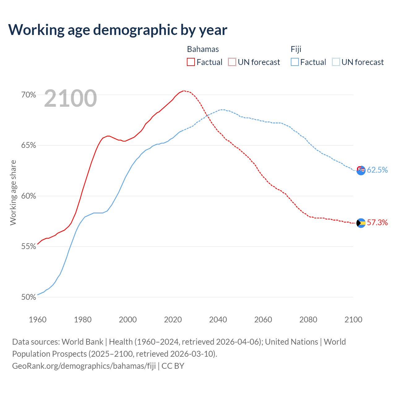 Median age Bahamas vs Fiji, 1960-2100