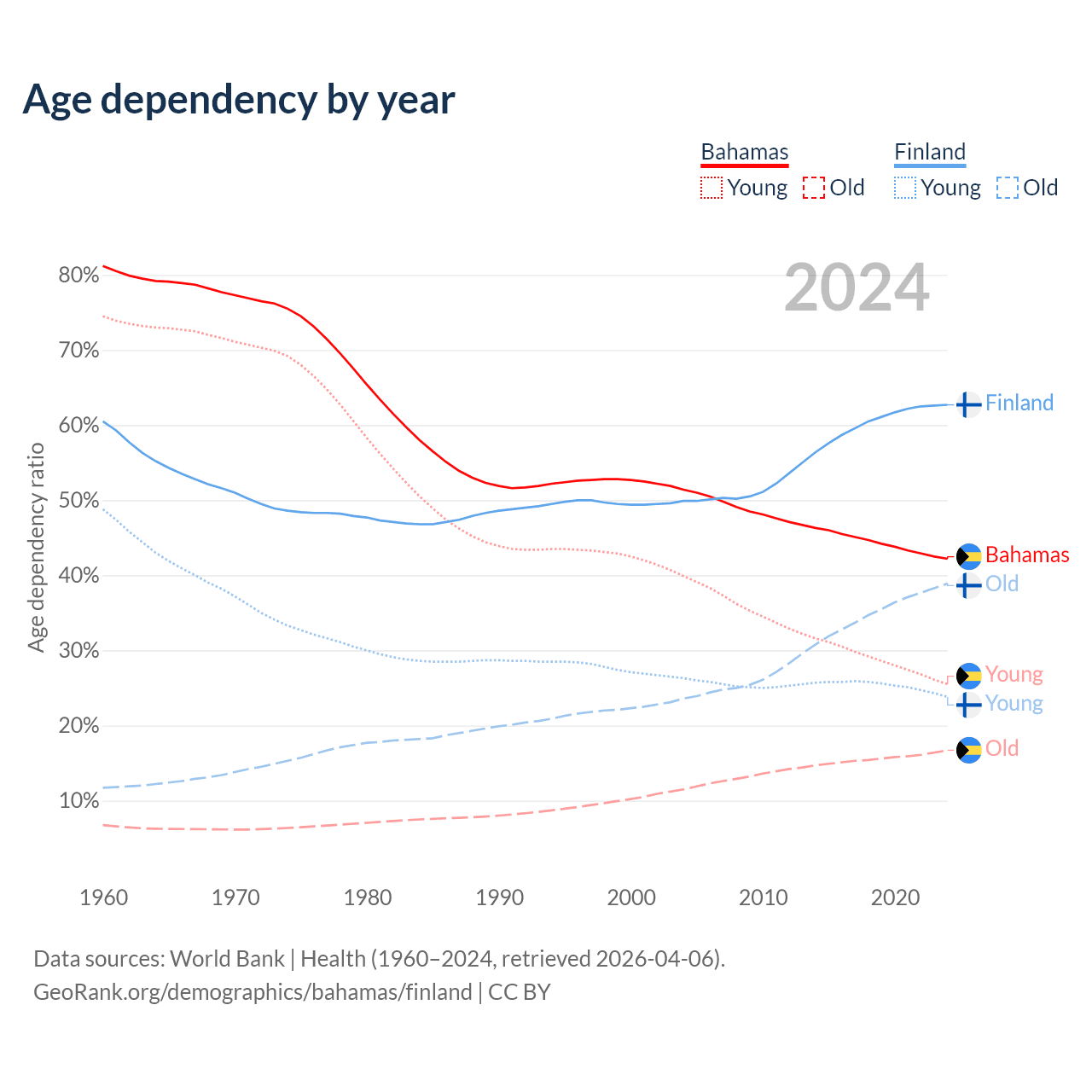 - The share of old-age demographic (65+) in the Bahamas is 11.8% vs 23.9% in Finland.
