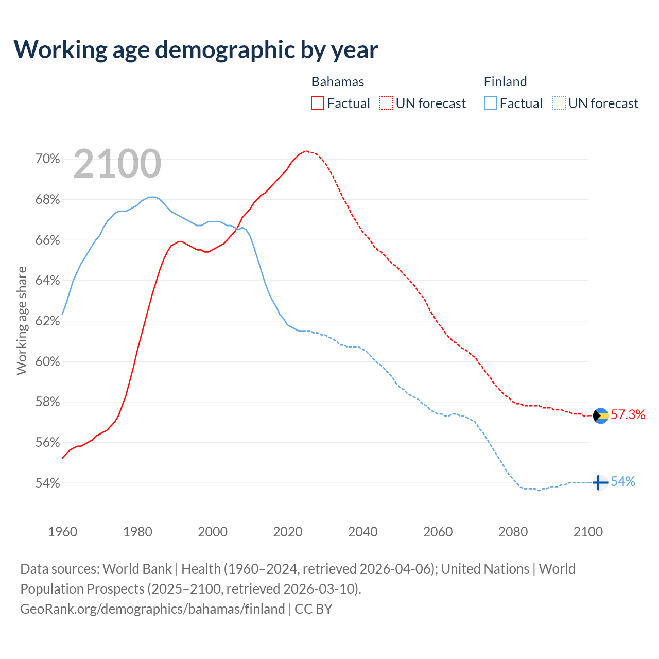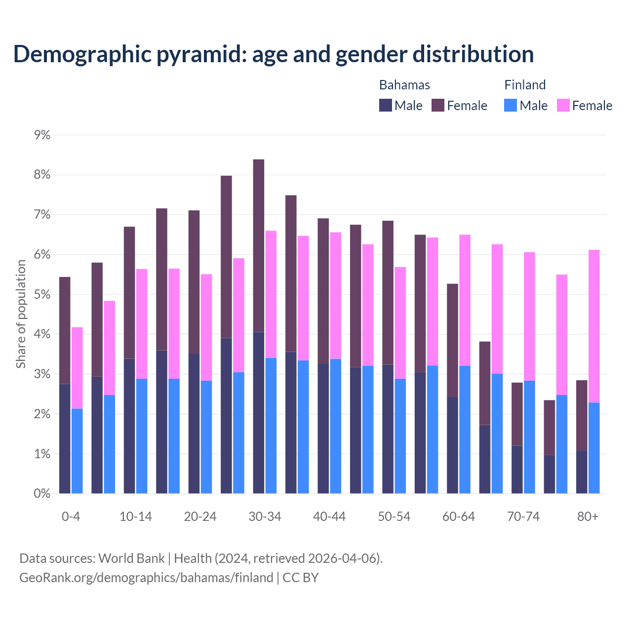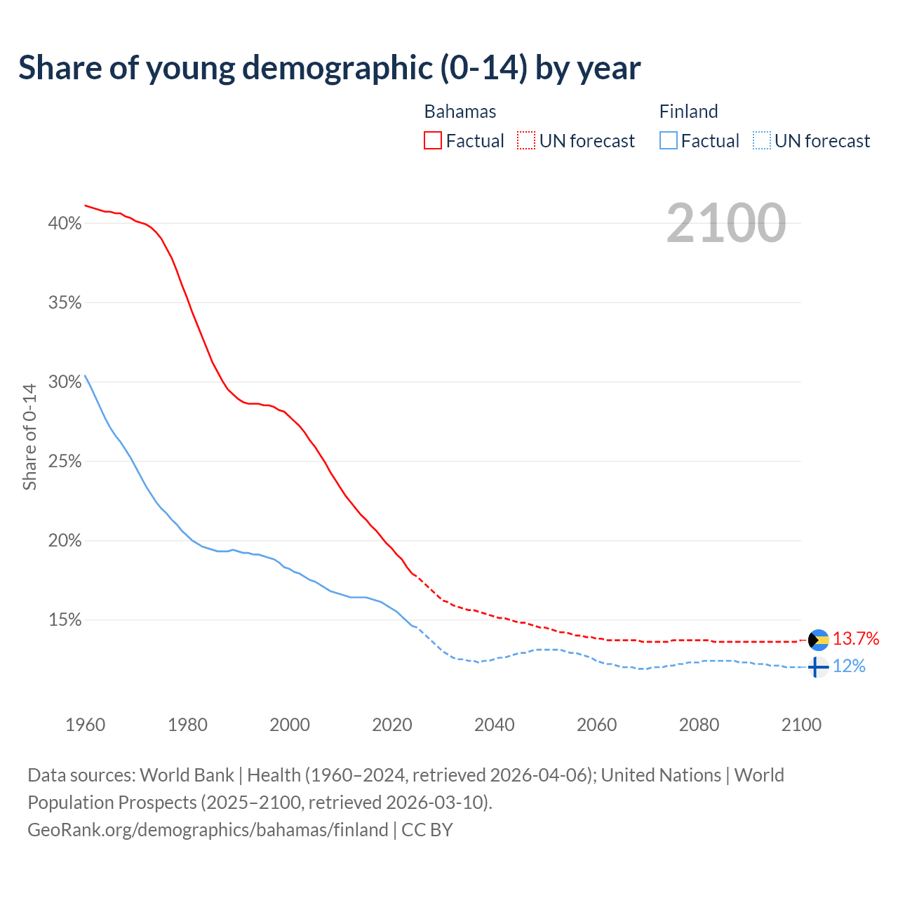 - The share of young demographic (0-15 years old) in the Bahamas is 17.9% vs 14.6% in Finland.