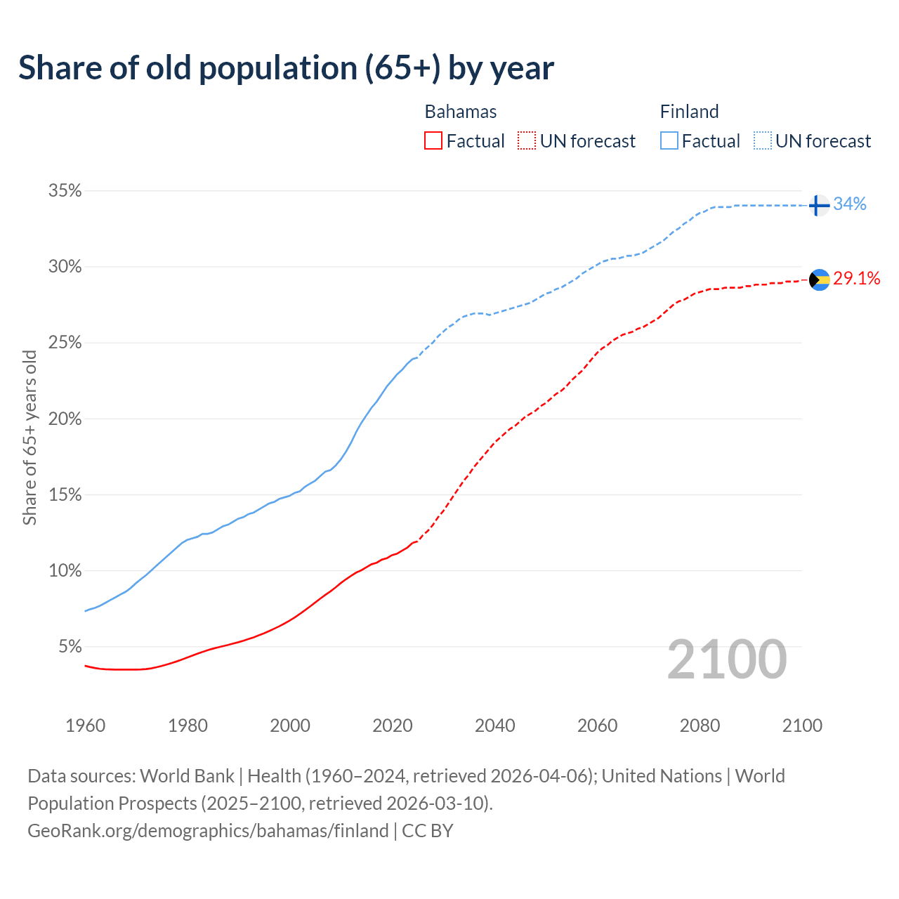 The share of older people aged 65 and over is 11.8% in the Bahamas and 23.9% in Finland. Life expectancy in the Bahamas compared to Finland .