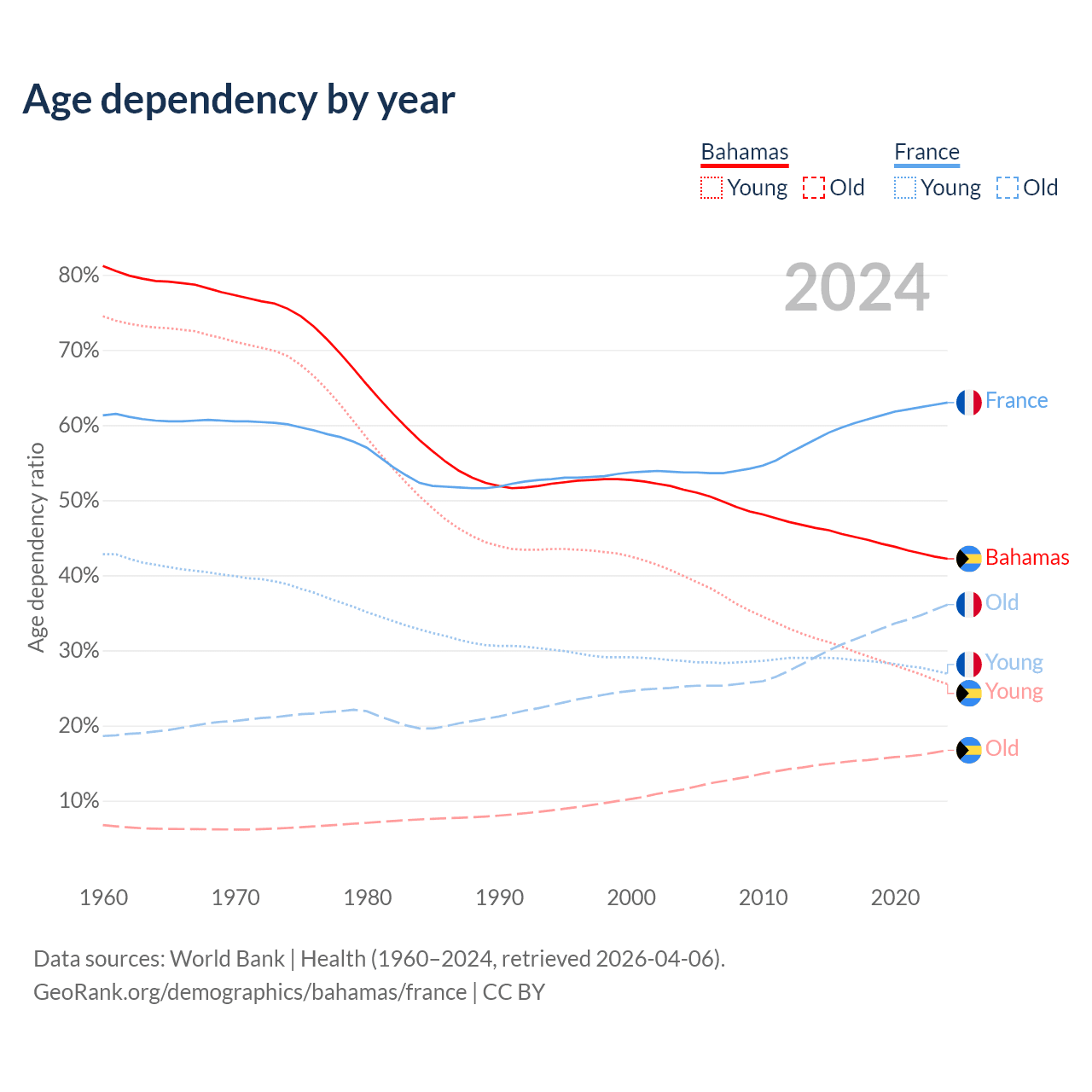 - The Bahamas is ranked 70/196 by median age (oldest to youngest) vs 29/196 for France.